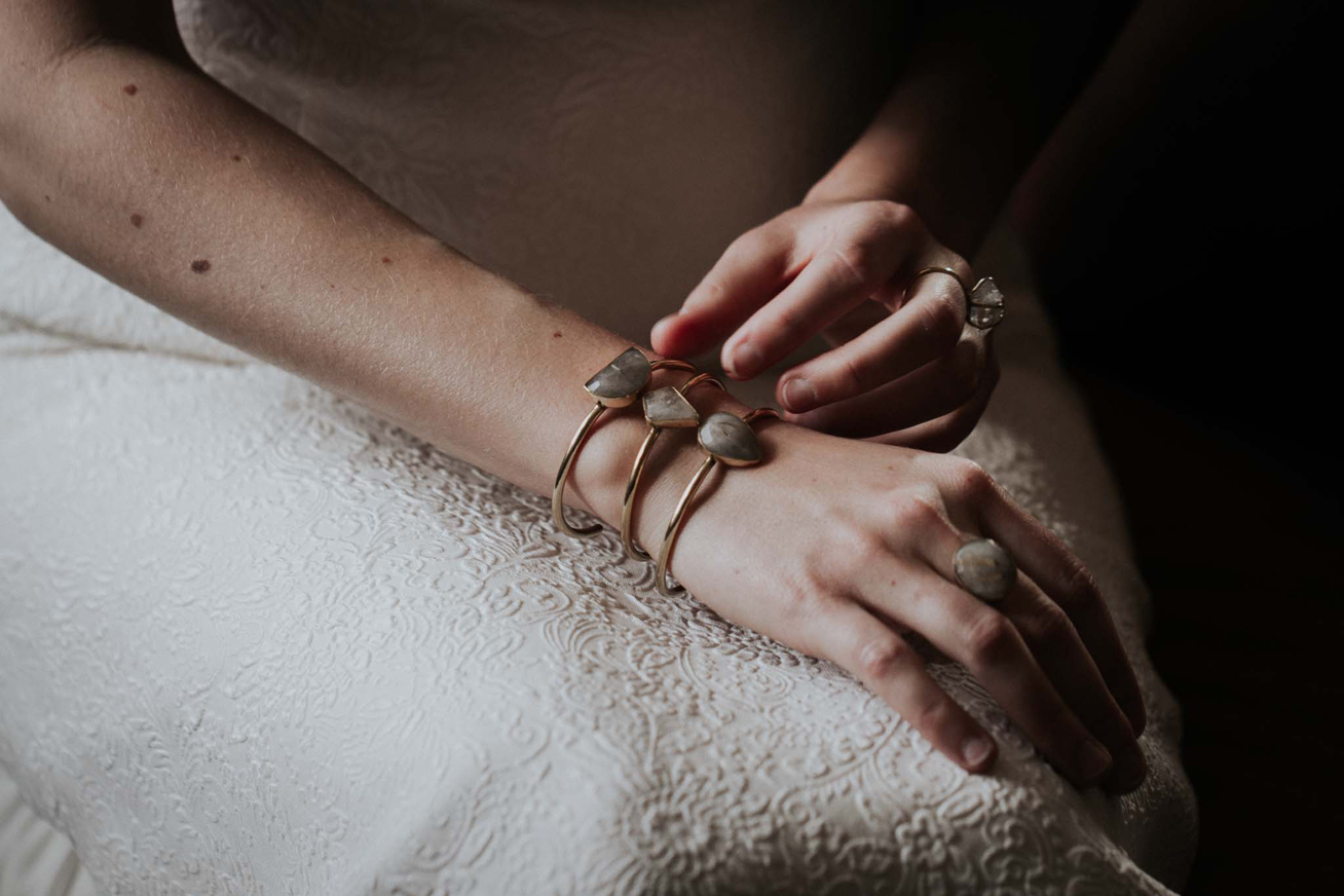 wanneer je denkt aan sieraden in jaren ’20 stijl, denk je in eerste instantie al snel aan flinke eyecatchers met de nodige dosis bling. de bobini roots interpretatie hiervan heeft geleid tot de creatie van verschillende, enkele cuffs, welke in combinatie met elkaar tóch een statement maken. gecombineerd met verschillende ringen, waaronder een precies matchende ring, om het evenwicht wat te bewaren. deze ring is, net zoals de cuffs verrijkt met prachtige rutiel kwarts edelstenen. doorzichtig met een subtiele, ‘gouden’ naalden, gevormd in honderden jaren tijd door onze eigen natuur – ‘bling’ op de meest natuurlijke manier. that’s how we like it! andere ringen welke je terug ziet op de foto’s zijn de acacia ring met herkimer diamant, verschillende stapelringen, de facet ringen als trouwringen. tenslotte hebben we gekozen om de vintage trouwjurk te verrijken met tassel oorbellen voor de bruid – grotere handgemaakte katoenen kwastjes, in combinatie met een messing oorbel in hexagon vorm. oorbellen met een vintage feel en de nodige pit; opvallend maar niet té. perfect voor een hoger gesloten jurk, waarbij een ketting al snel een beetje too much kan worden. de oker kleur paste helemaal in de vintage setting met natuurlijke tinten.