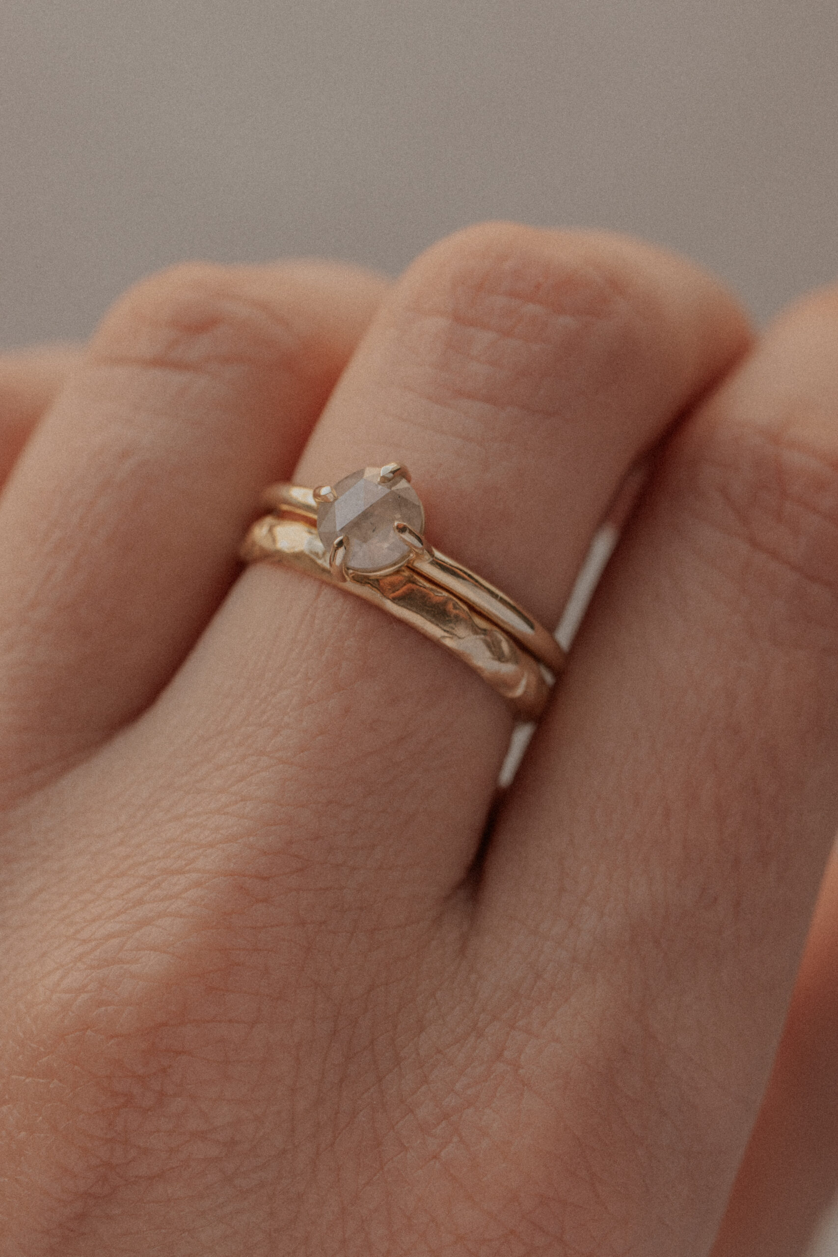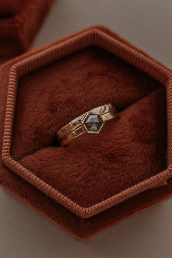 Een van onze molten ringen gecombineerd met een ring met een bijzondere zout-en-peper hexagon diamant. Zoals de naam al zegt, heeft de molten ring een gesmolten structuur die ontstaat via de verloren wasmethode, waardoor geen enkele ring precies hetzelfde is. Ook elk zout-en-peper diamantje is, net als onze ringen, uniek. De karaktervolle insluitsels in elke diamant maken dat iedere steen zijn eigen verhaal vertelt. En deze hexagon diamant vinden wij dan ook écht prachtig!