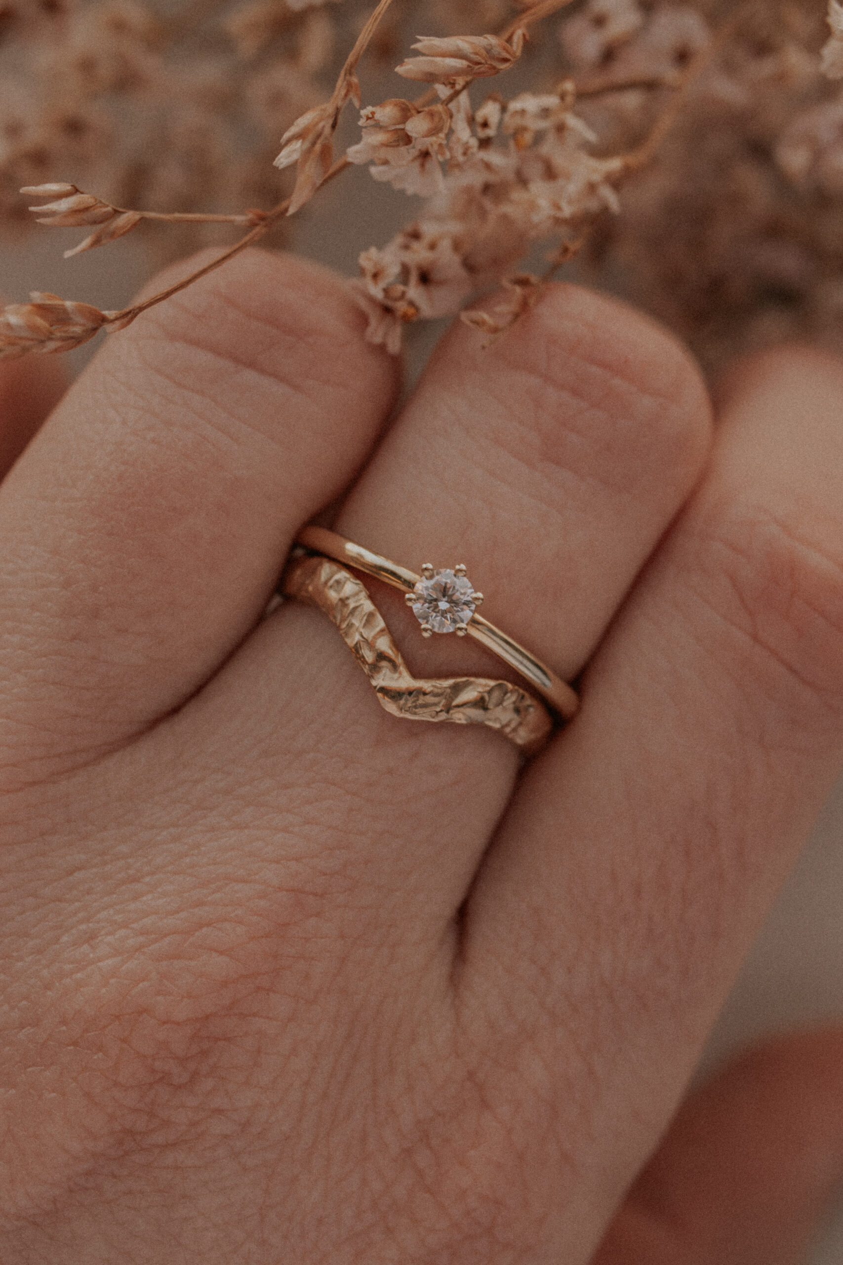 Een klassieke solitaire ring, perfect als verlovingsring, past wat ons betreft altijd prachtig bij een arrow ring. Voor deze stack kozen we alleen niet de standaard arrow, maar één van onze molten varianten. Dat geeft de stack nét dat beetje extra karakter en geeft de solitaire een stoerdere tegenhanger ten opzichte van een combinatie met een klassieke arrow.