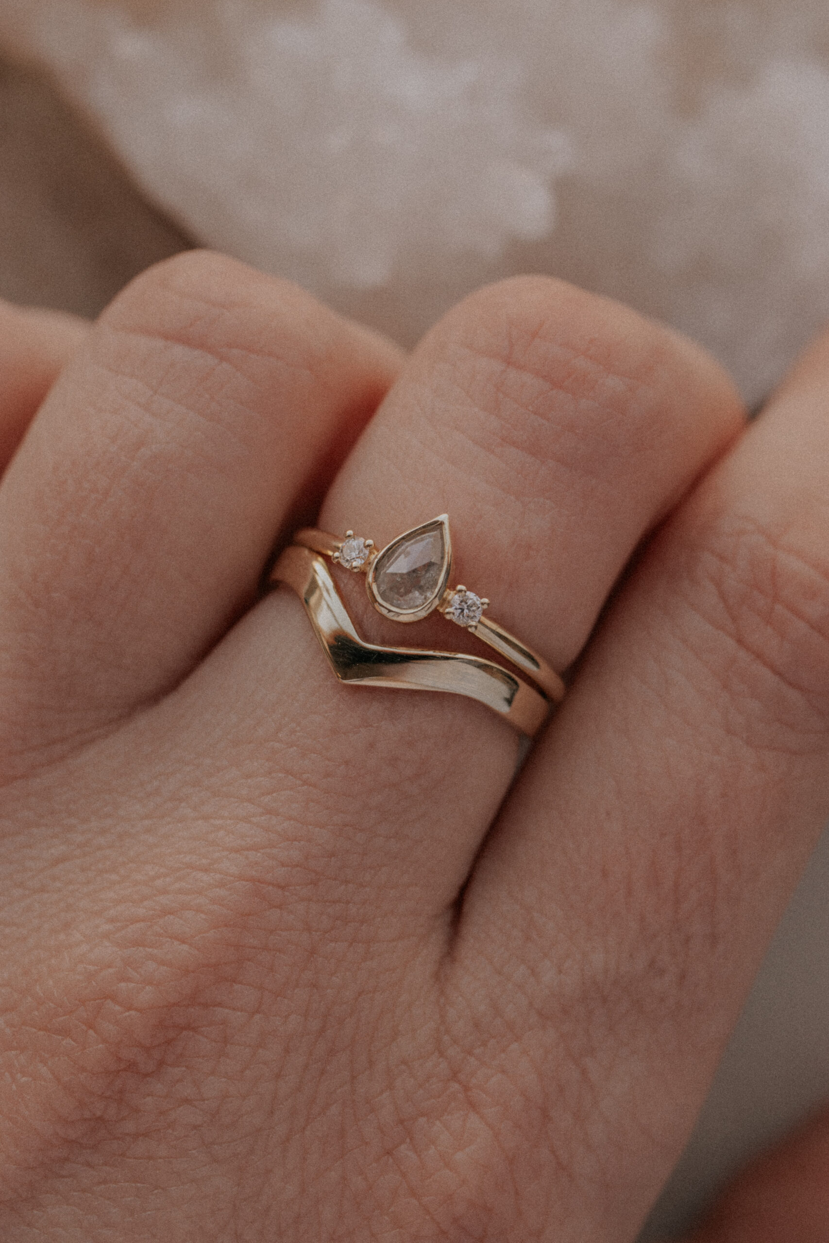 Een prachtige ring met druppelvormige ‘ice’ diamant en twee accent briljanten, gecombineerd met onze ever so timeless arrow ring. Met zo’n combinatie zit je wat ons betreft altijd goed. Wat deze set extra bijzonder maakt, is de veelzijdigheid binnen de stack. Je kunt eindeloos variëren: draai de druppeldiamant zodat het puntje precies in de arrow ring valt, of draag de arrow ring juist boven de diamanten ring.
