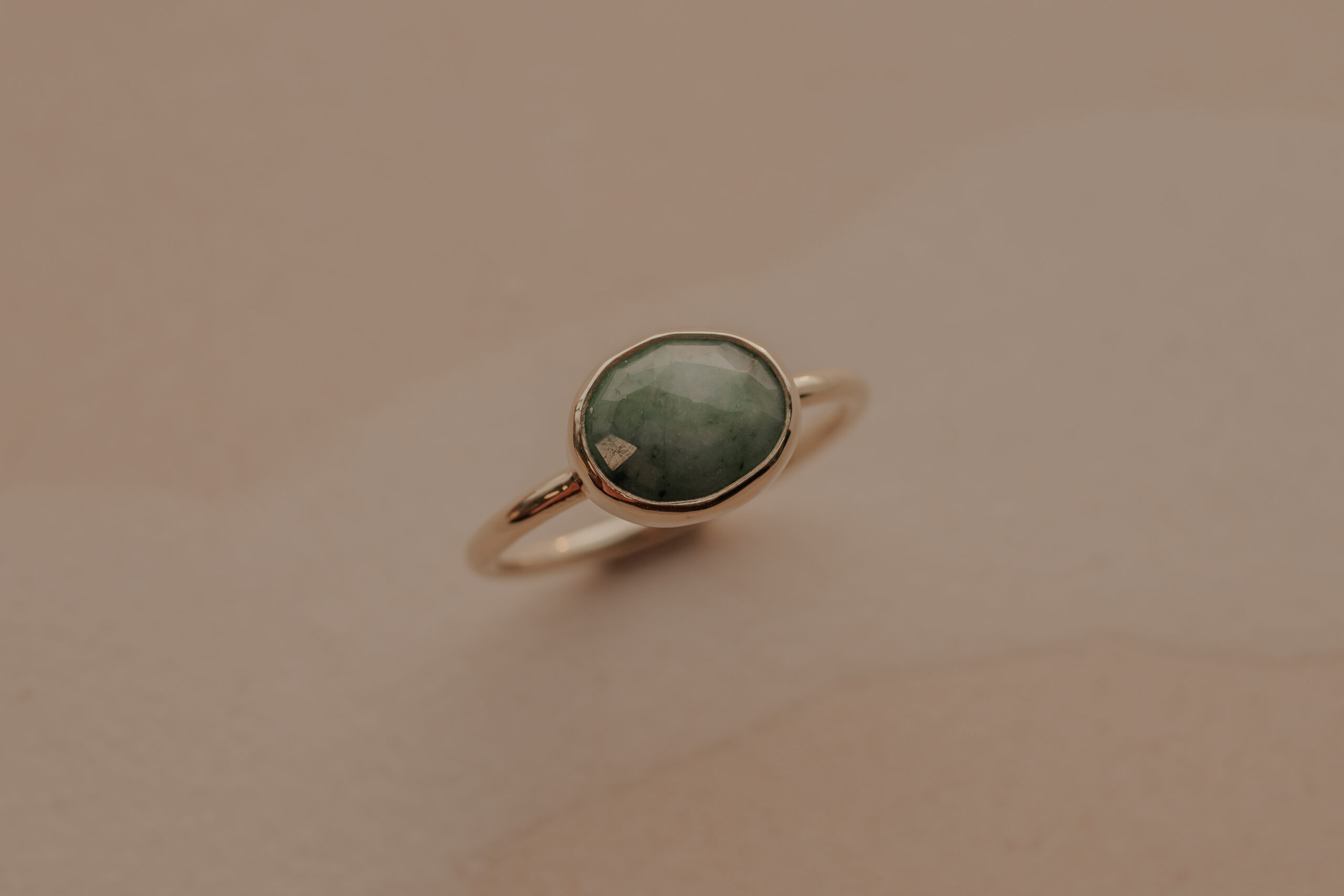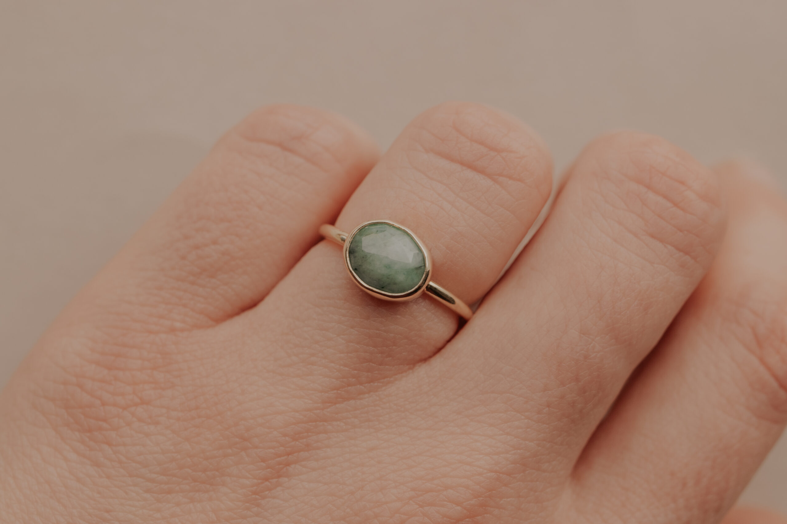 Deze 14 karaat geelgouden ring heeft een dikte van 1.5 mm. De ring is verrijkt met een ovaal, roos geslepen smaragd edelsteen van ongeveer 8 x 10 mm.