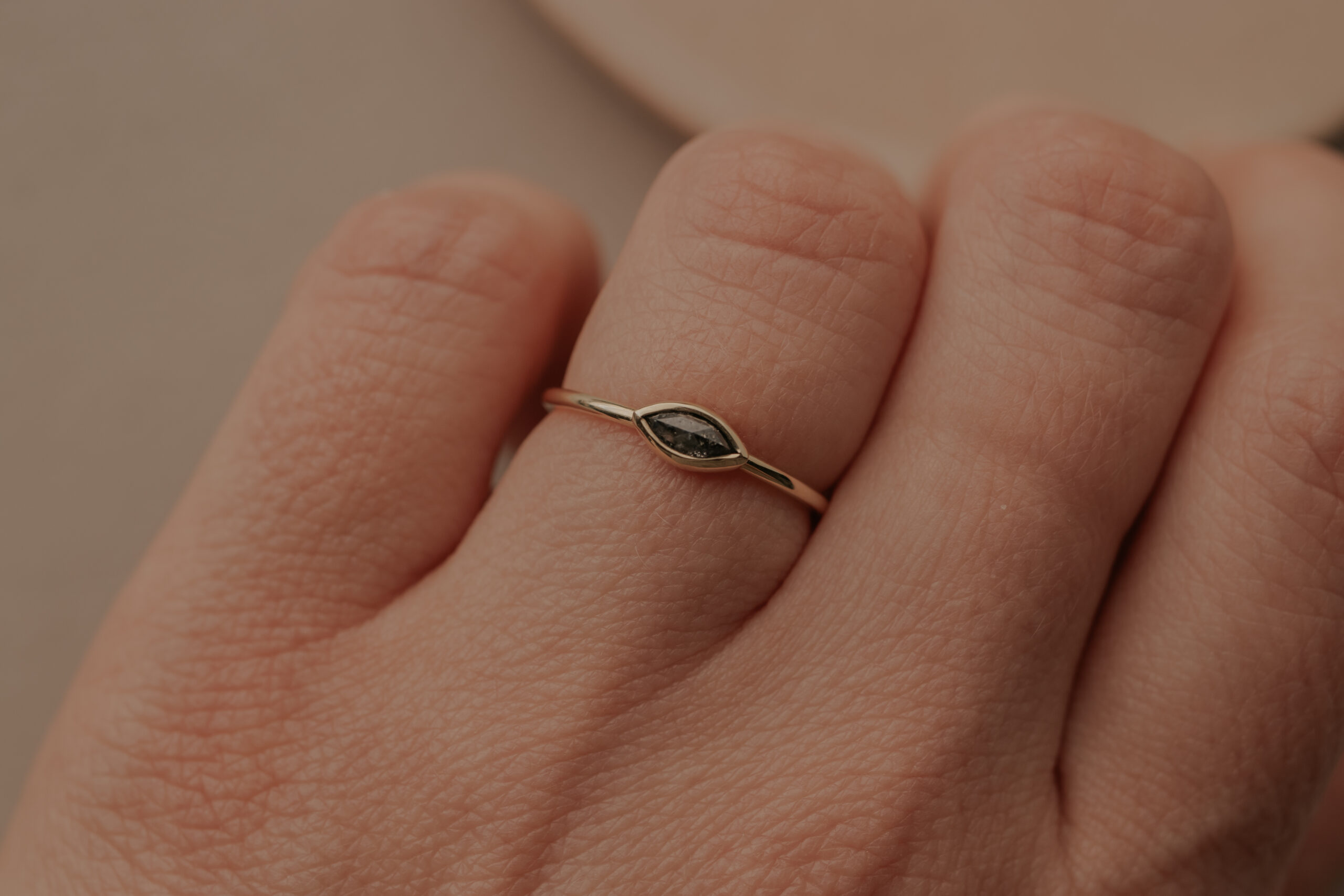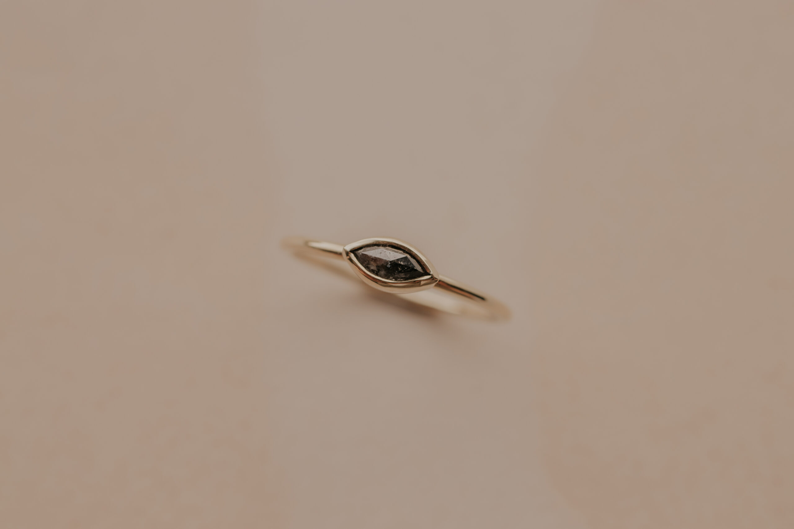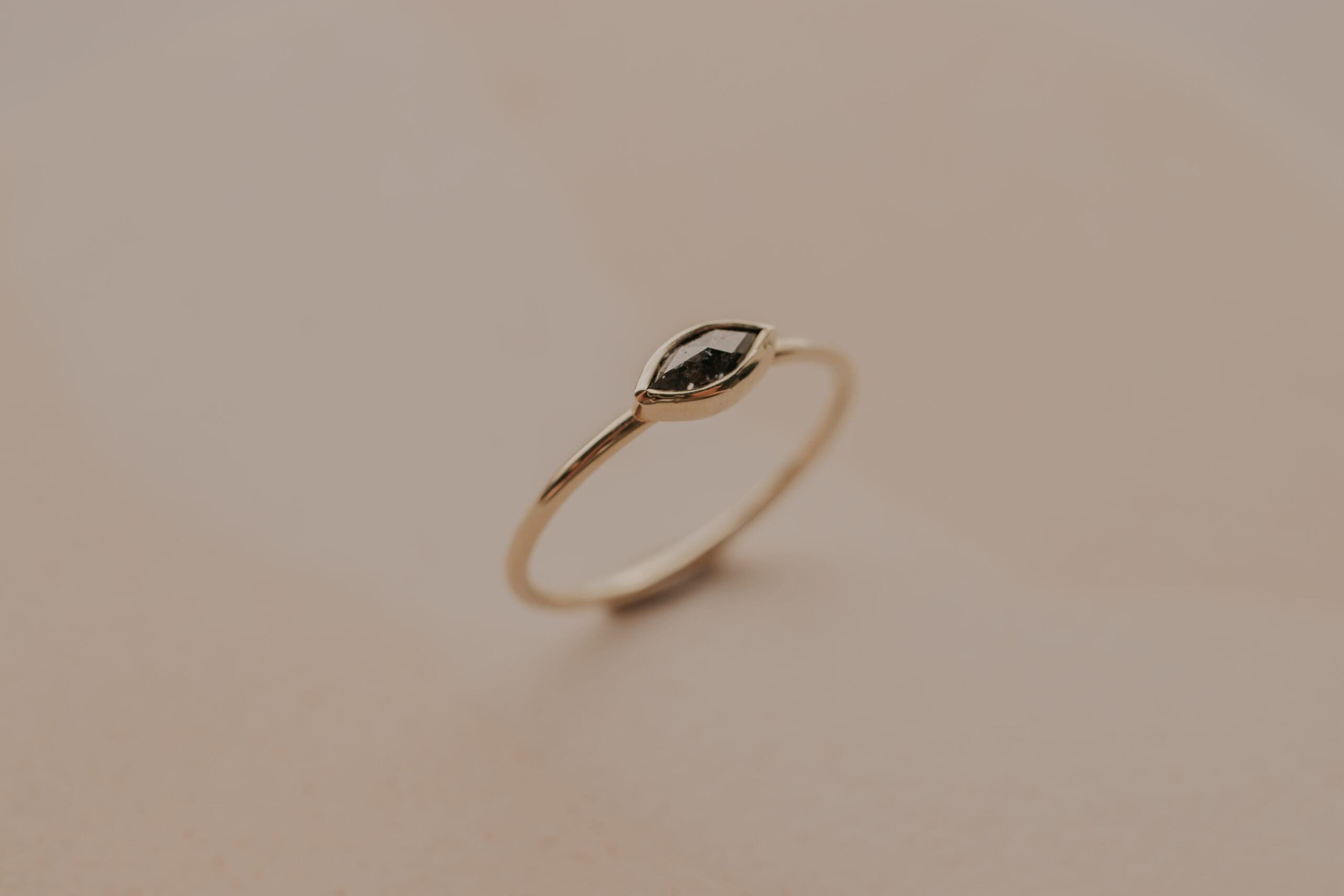 Deze 14 karaat geelgouden ring heeft een dikte van 1.2 mm en is daarmee een fijne ring. De ring is verrijkt met een markiesgeslepen ‘salt and pepper’ diamant van 5.9 x 3 x 1.4 mm, gezet in een zetkastje.