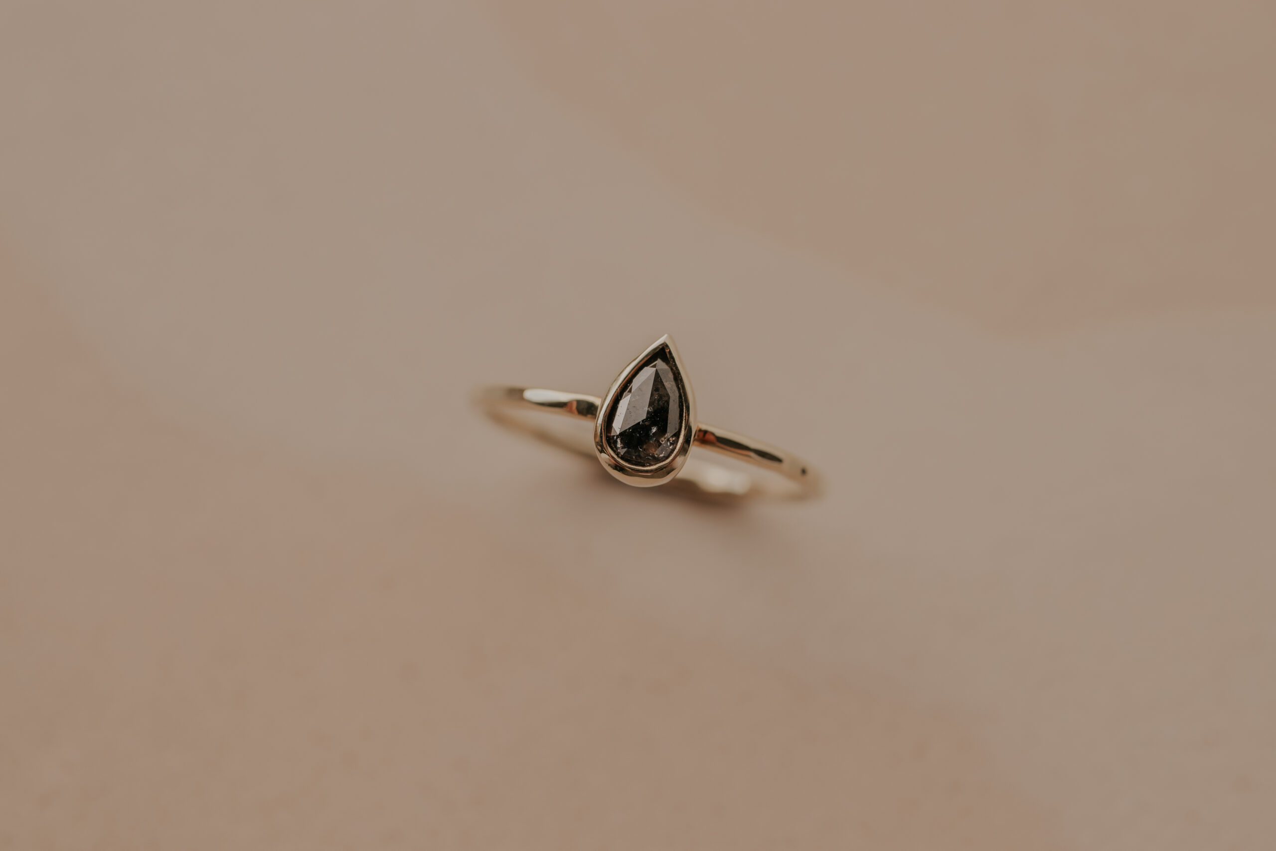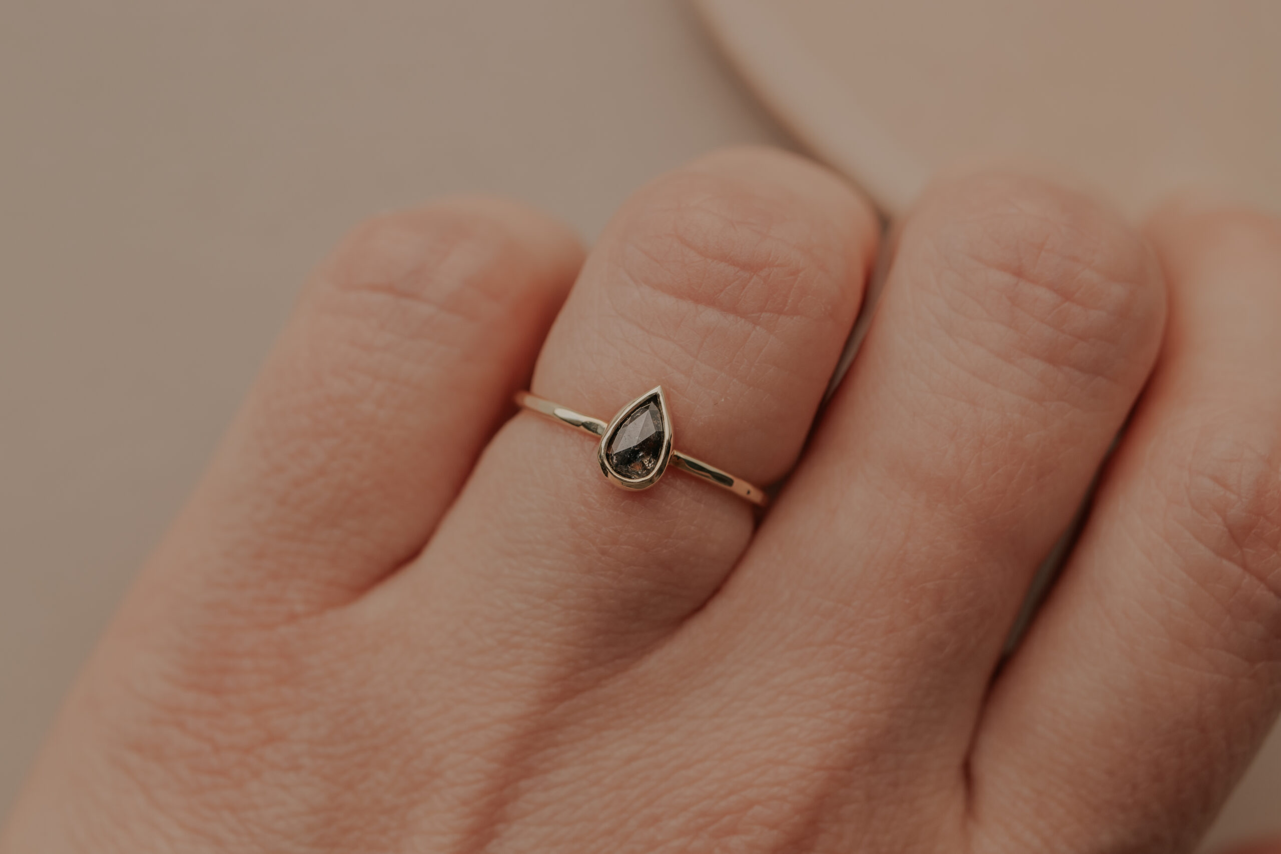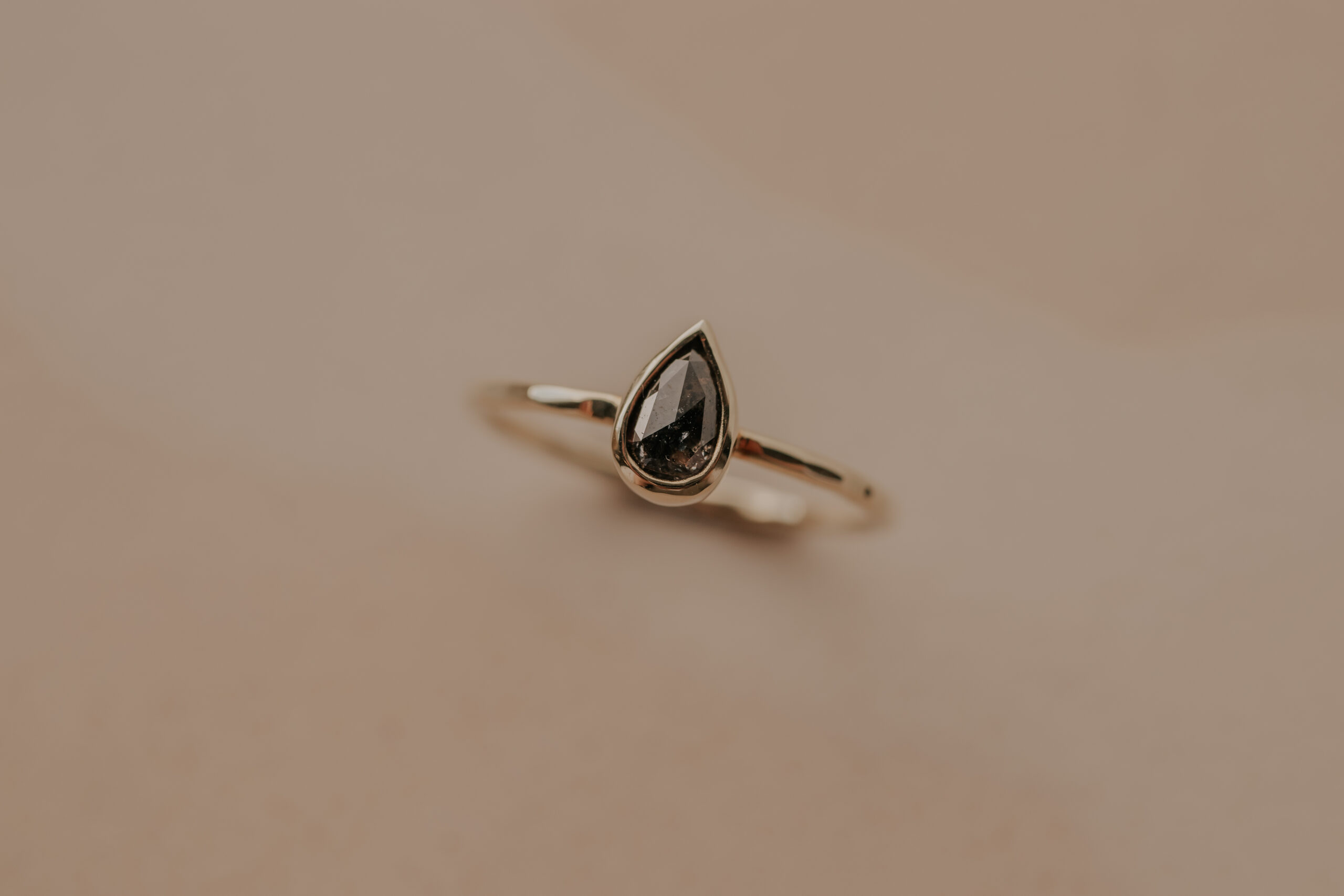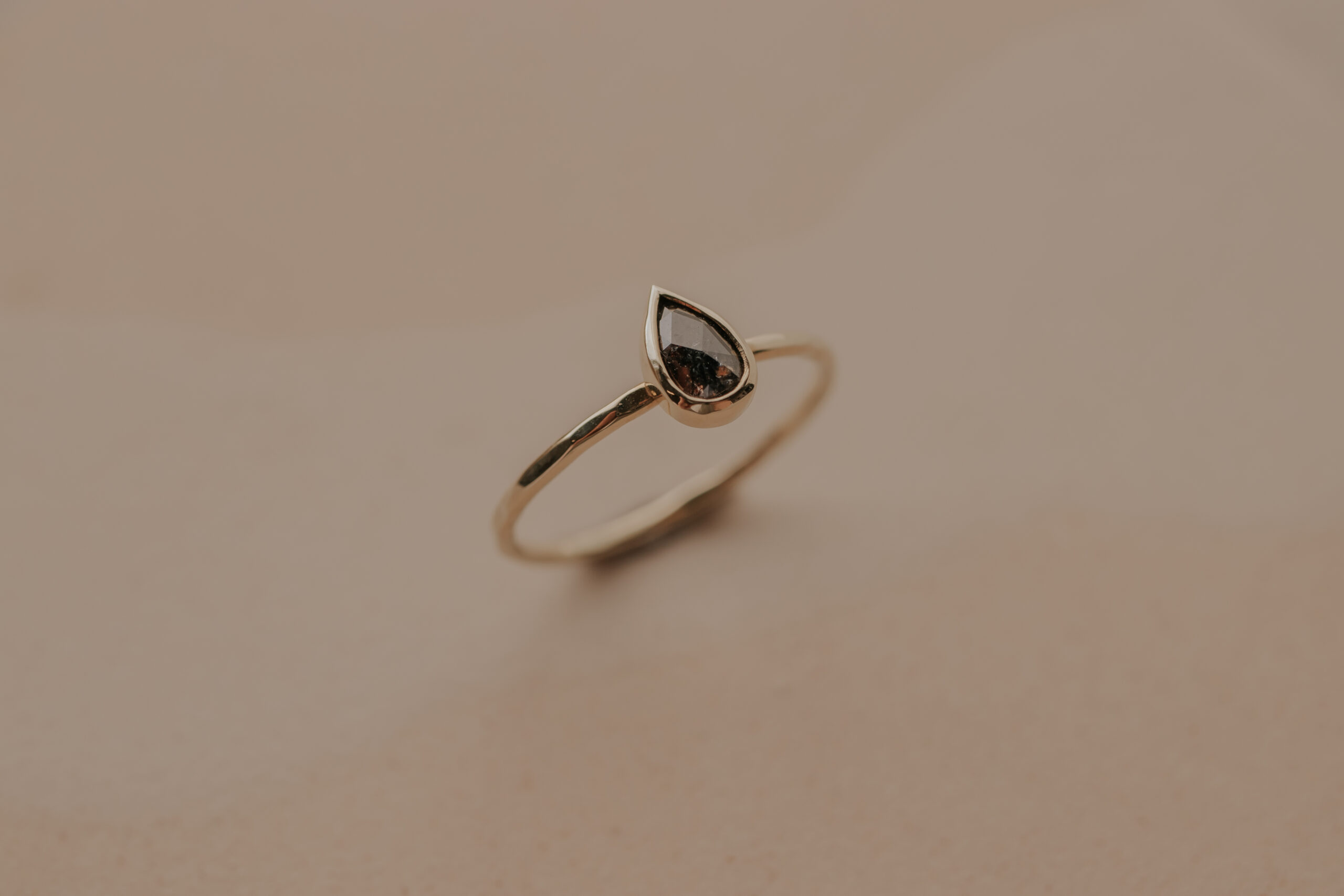 Deze 14 karaat geelgouden ring heeft een dikte van 1.2 mm en is daarmee een fijne ring. De ring is verrijkt met een druppelgeslepen ‘salt and pepper’ diamant van 5.9 x 3.9 x 2 mm, gezet in een zetkastje.