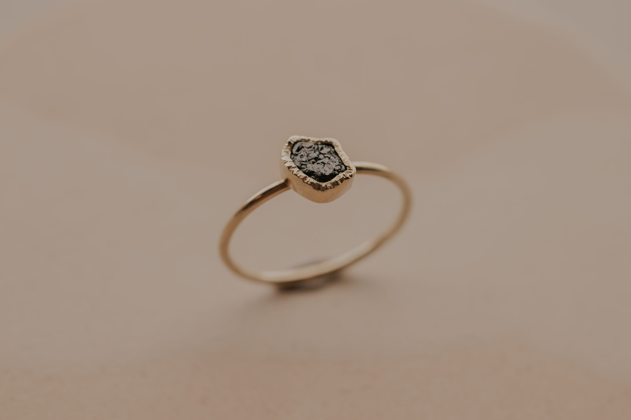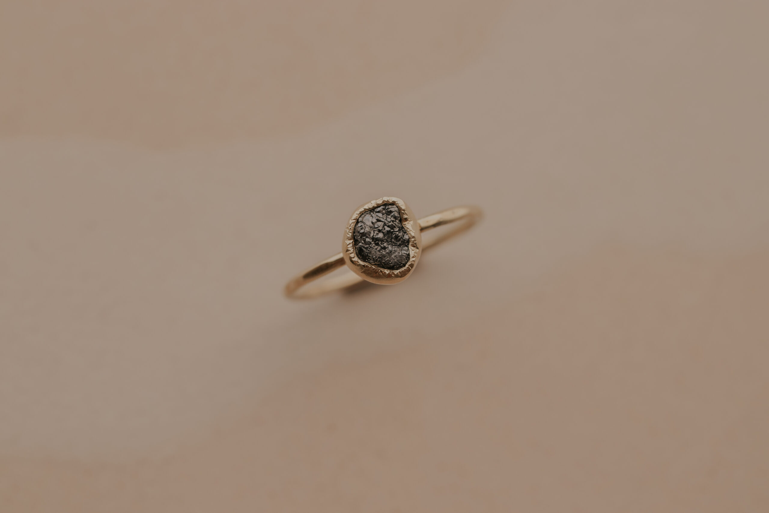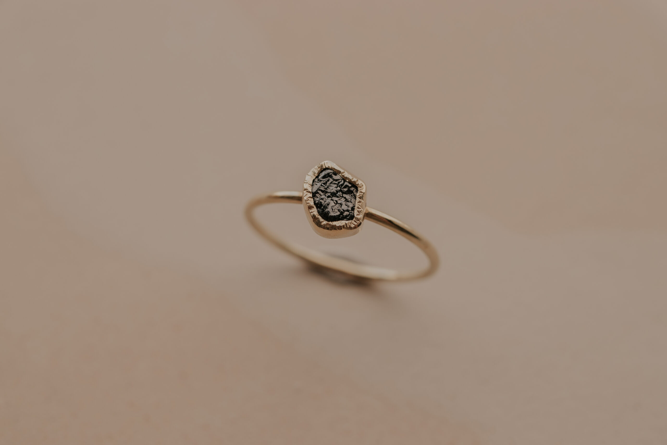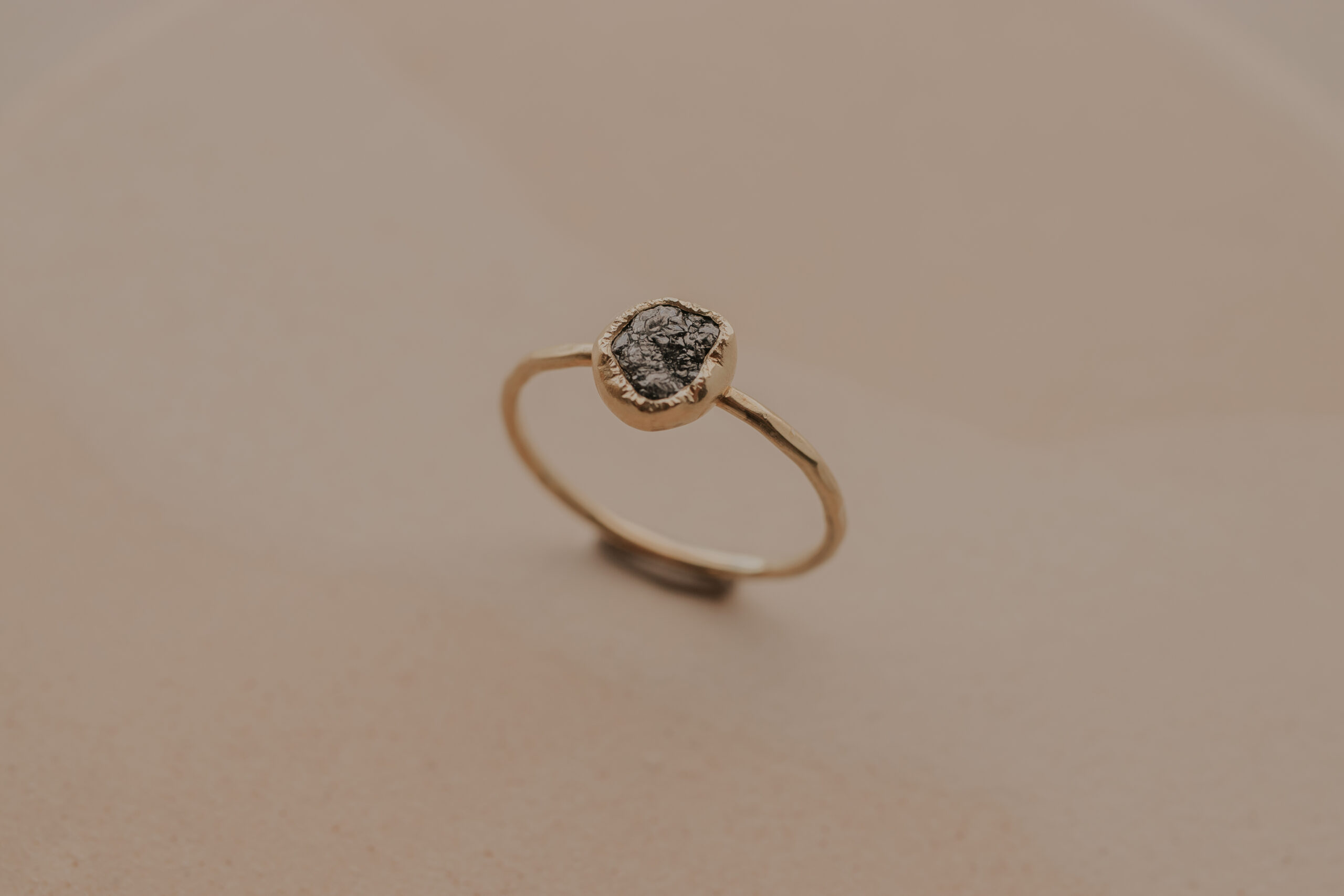 Deze 14 karaat geelgouden ring heeft een dikte van 1.2 mm en is daarmee een fijne ring. De ring is verrijkt met een zwarte/donkergrijze ruwe diamant van 5 – 6 mm, gezet in een gehamerd zetkastje.