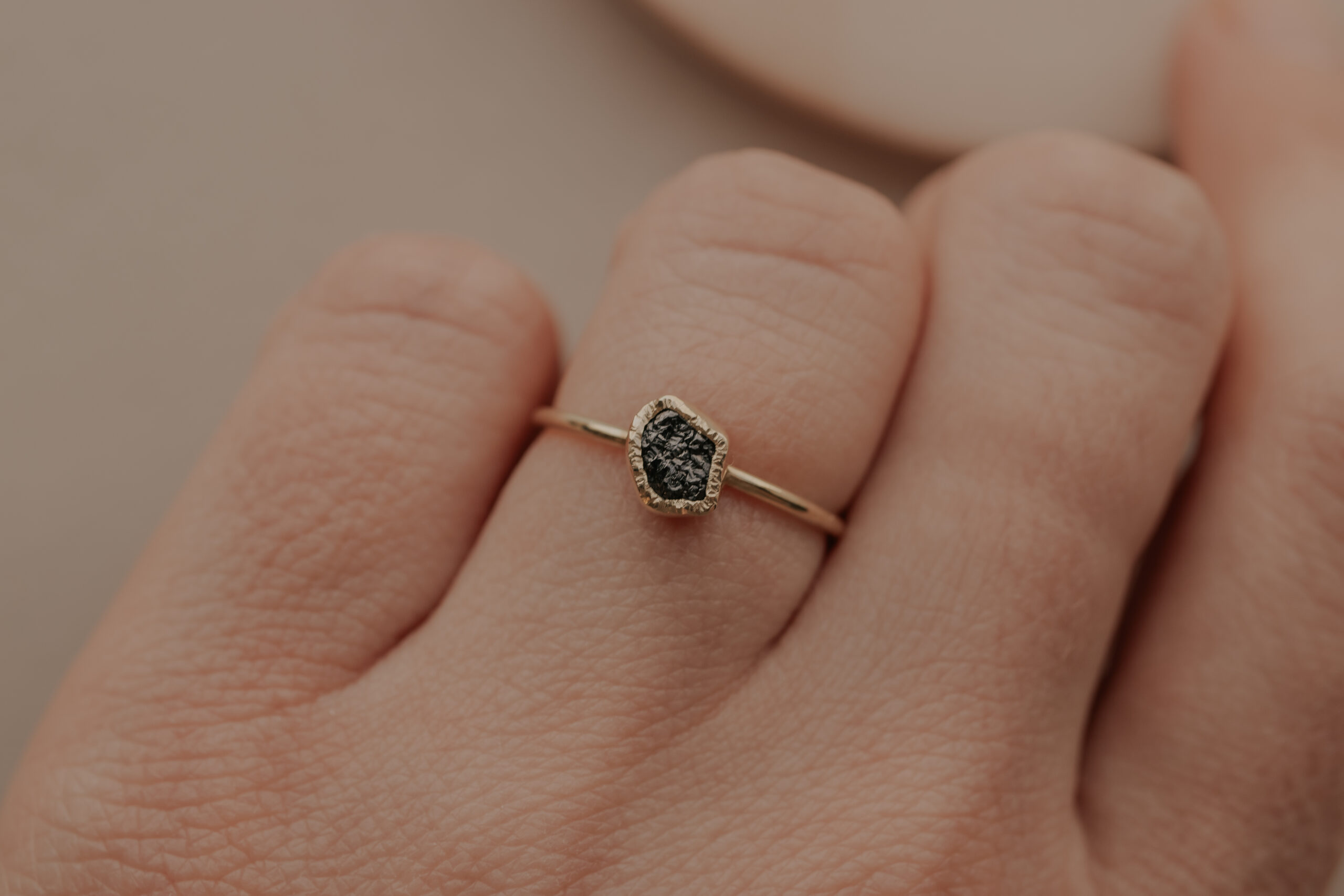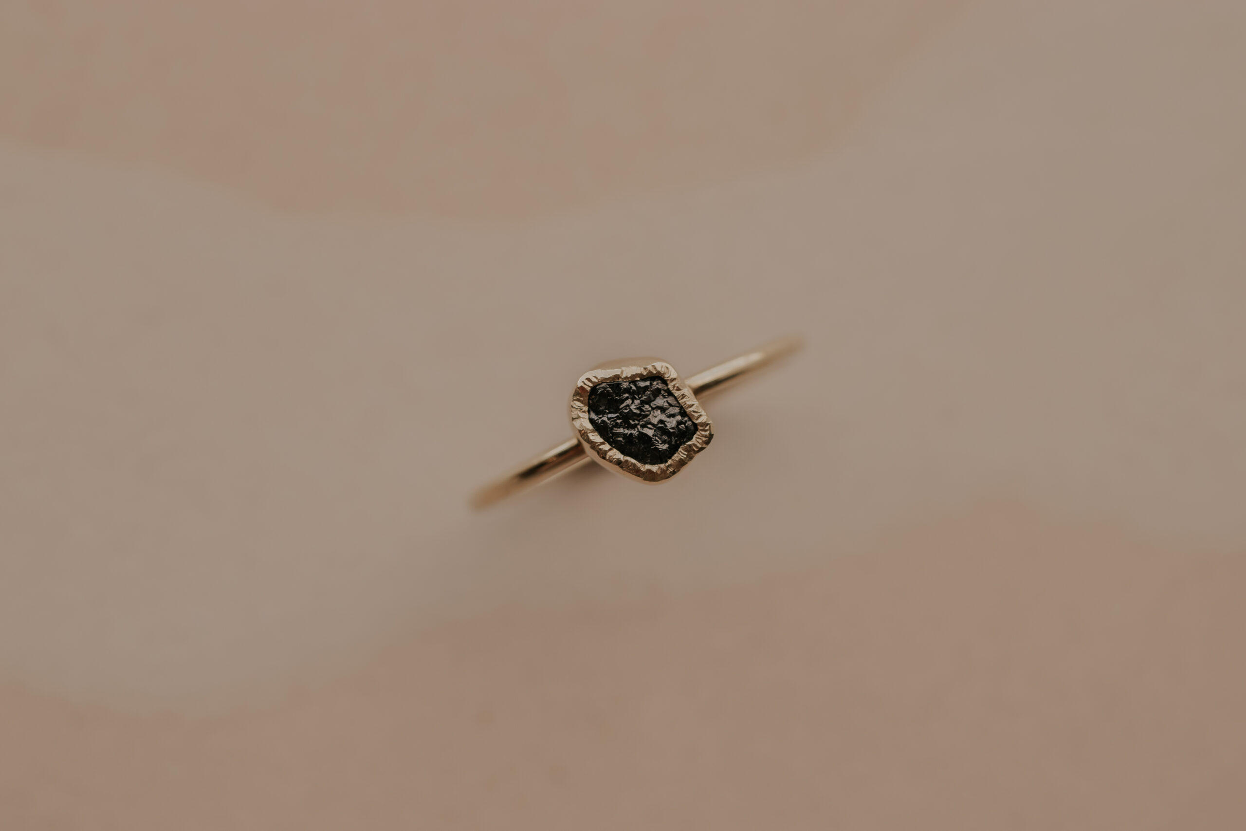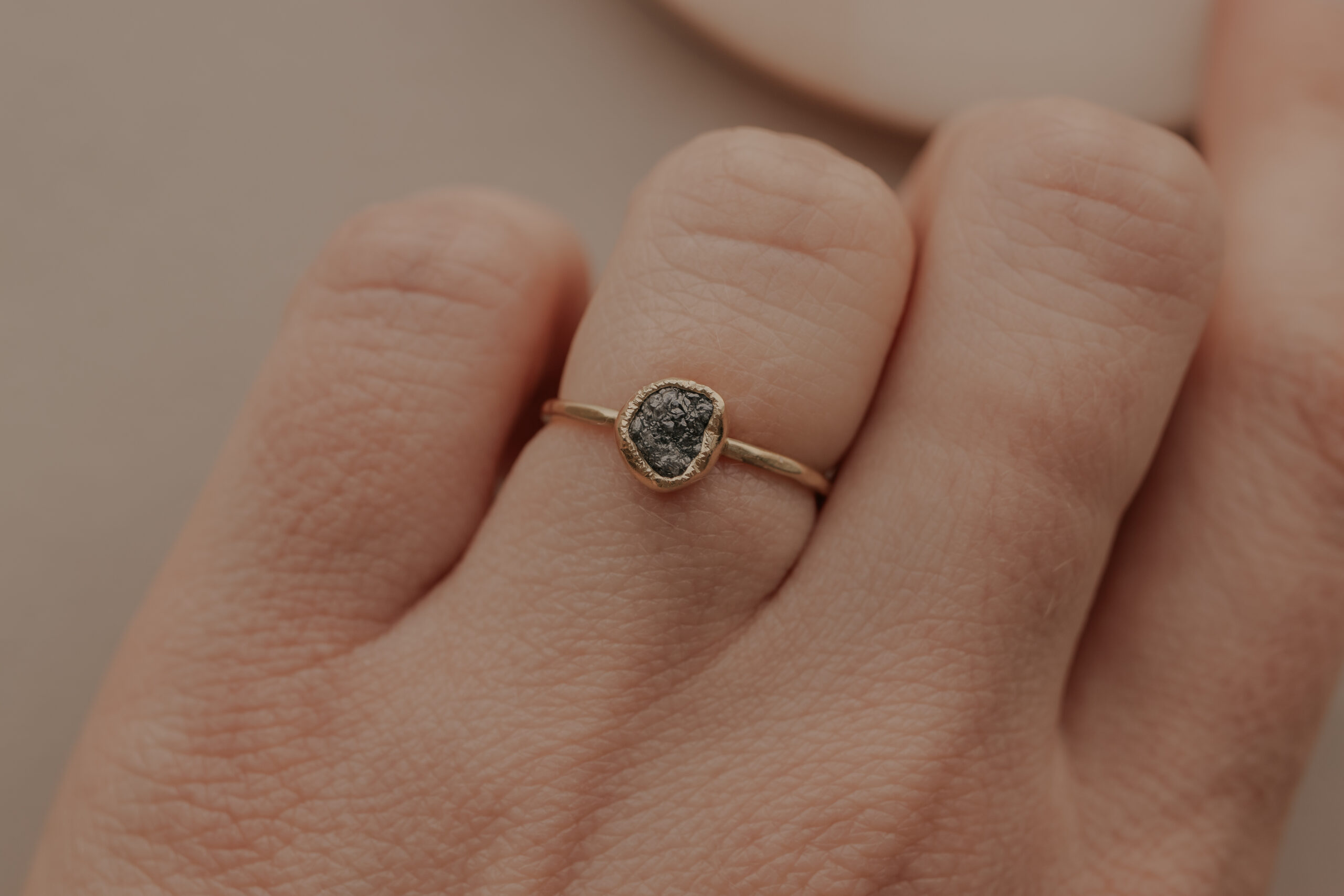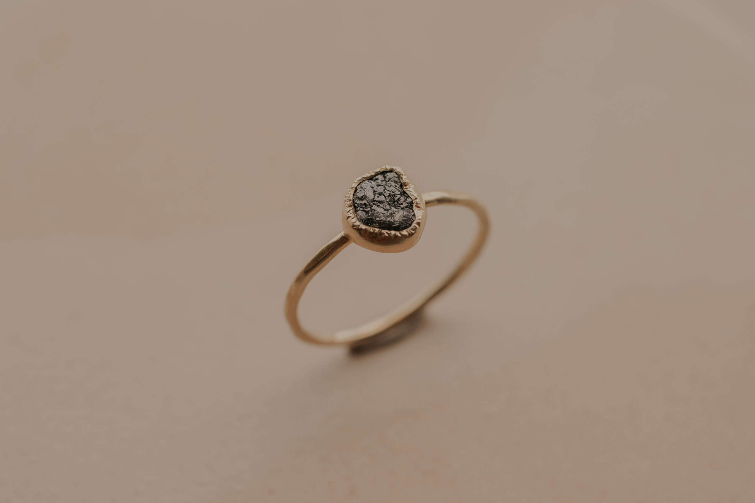 Deze 14 karaat geelgouden ring heeft een dikte van 1.2 mm en is daarmee een fijne ring. De ring is verrijkt met een zwarte/donkergrijze ruwe diamant van 5 – 6 mm, gezet in een gehamerd zetkastje.