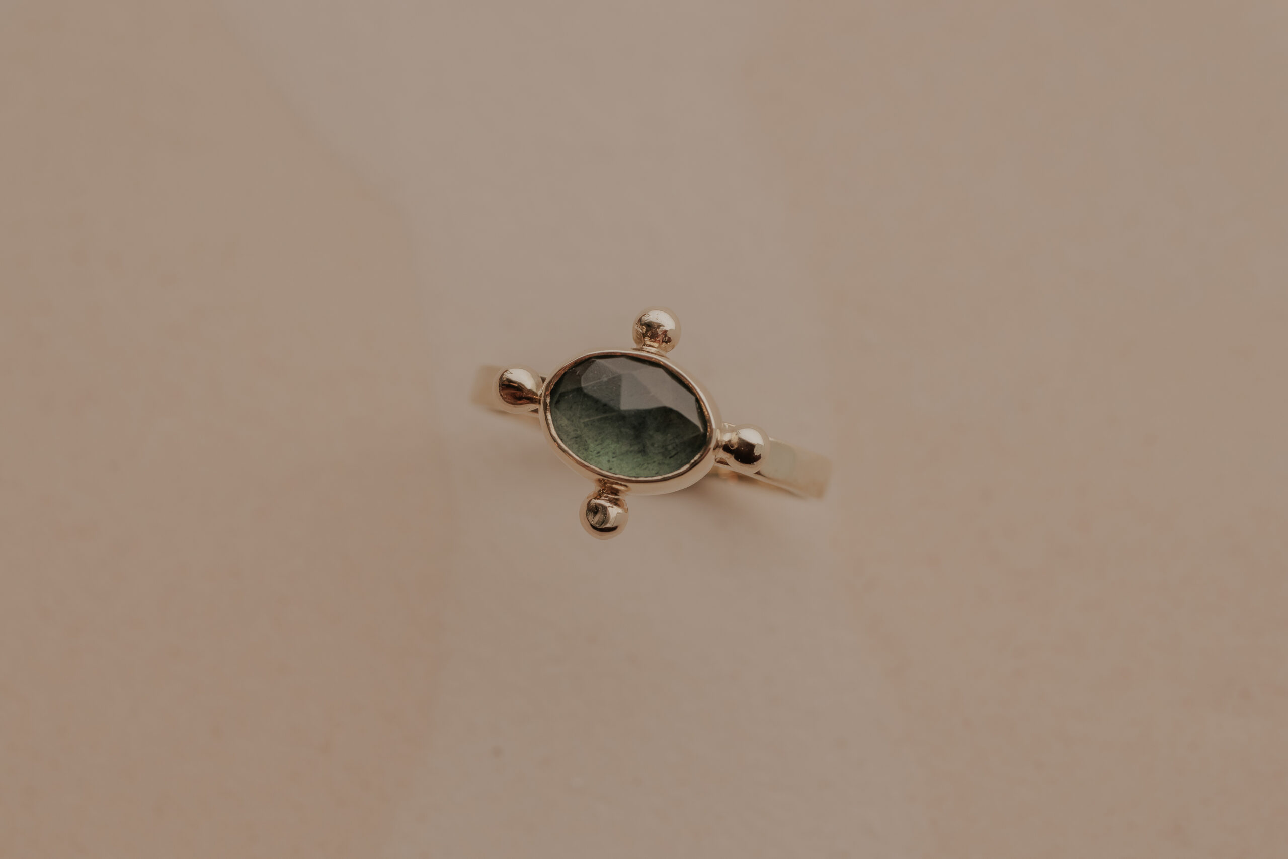Deze 14 karaat geelgouden ring heeft een breedte van 2 mm en een dikte van 1 mm. De ring is verrijkt met een ovaal, roos geslepen mos aquamarijn edelsteen van ongeveer 6 x 8 mm.