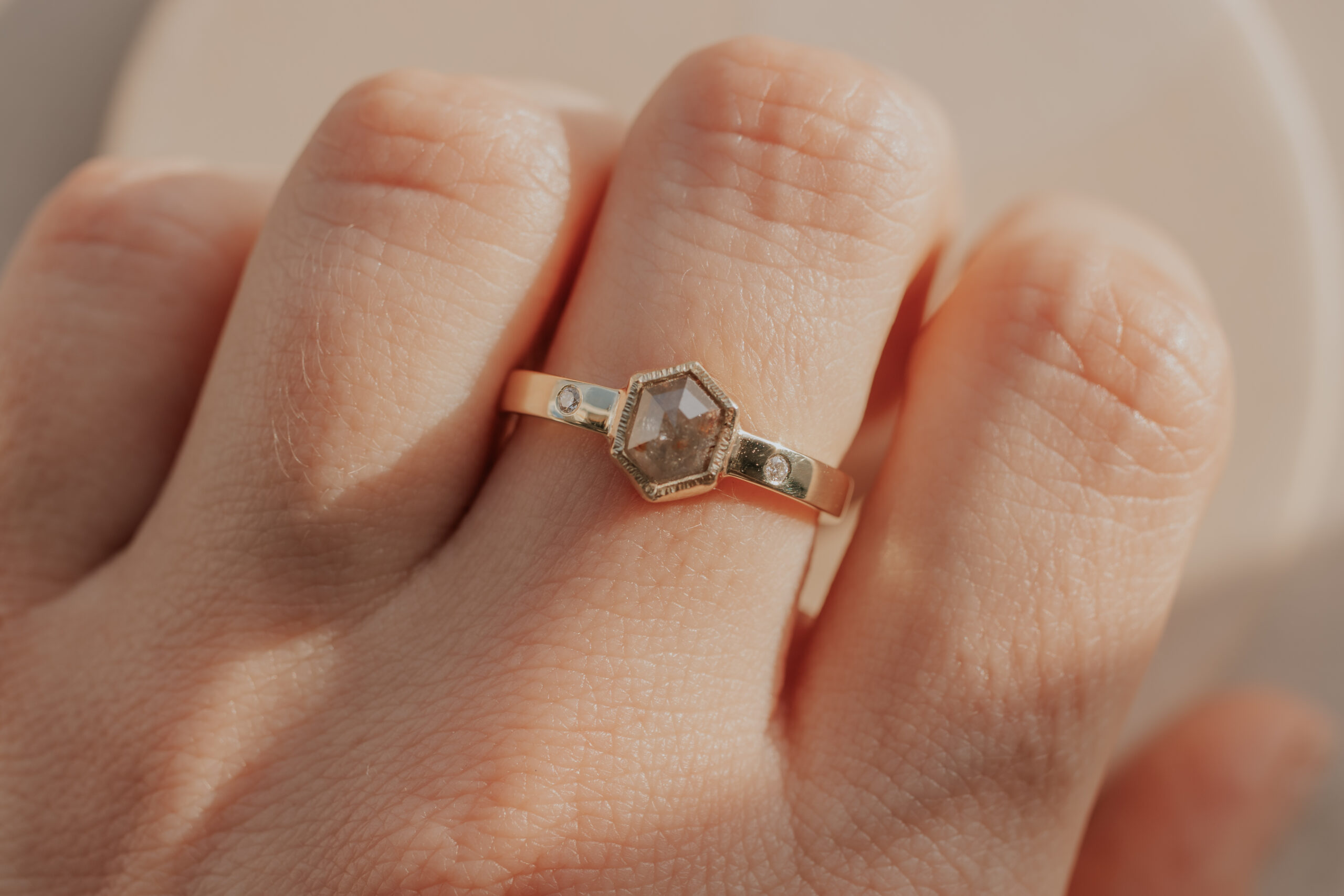 The ringband of this 14k gold ring is about 2.6 mm wide and 1.5 mm thick. This unique hexagon diamond is set in a bezel with a hammered edge. The diamond measures about 7.5 x 5.8 mm. The accent diamonds are SIH quality and measure 1.5 mm.