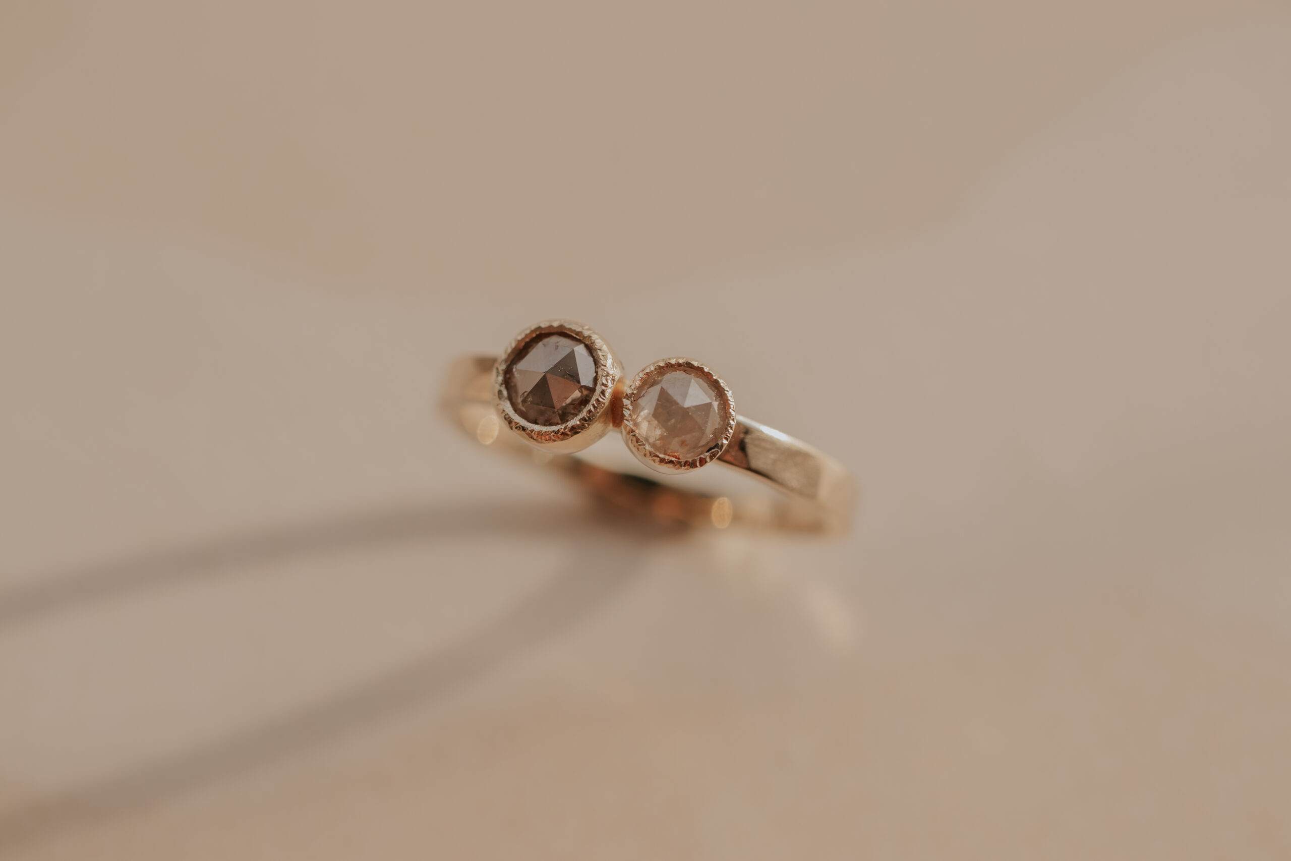 Deze 14 karaat warm geelgouden ring heeft een dikte van 2 x 1.2 mm. De ring is verrijkt met twee warm bruine, roosgeslepen diamanten van 4.5 en 4 mm, gezet in een gehamerd zetkastje. De ring heeft een organische hamerslag en een satijn glanzende finish.