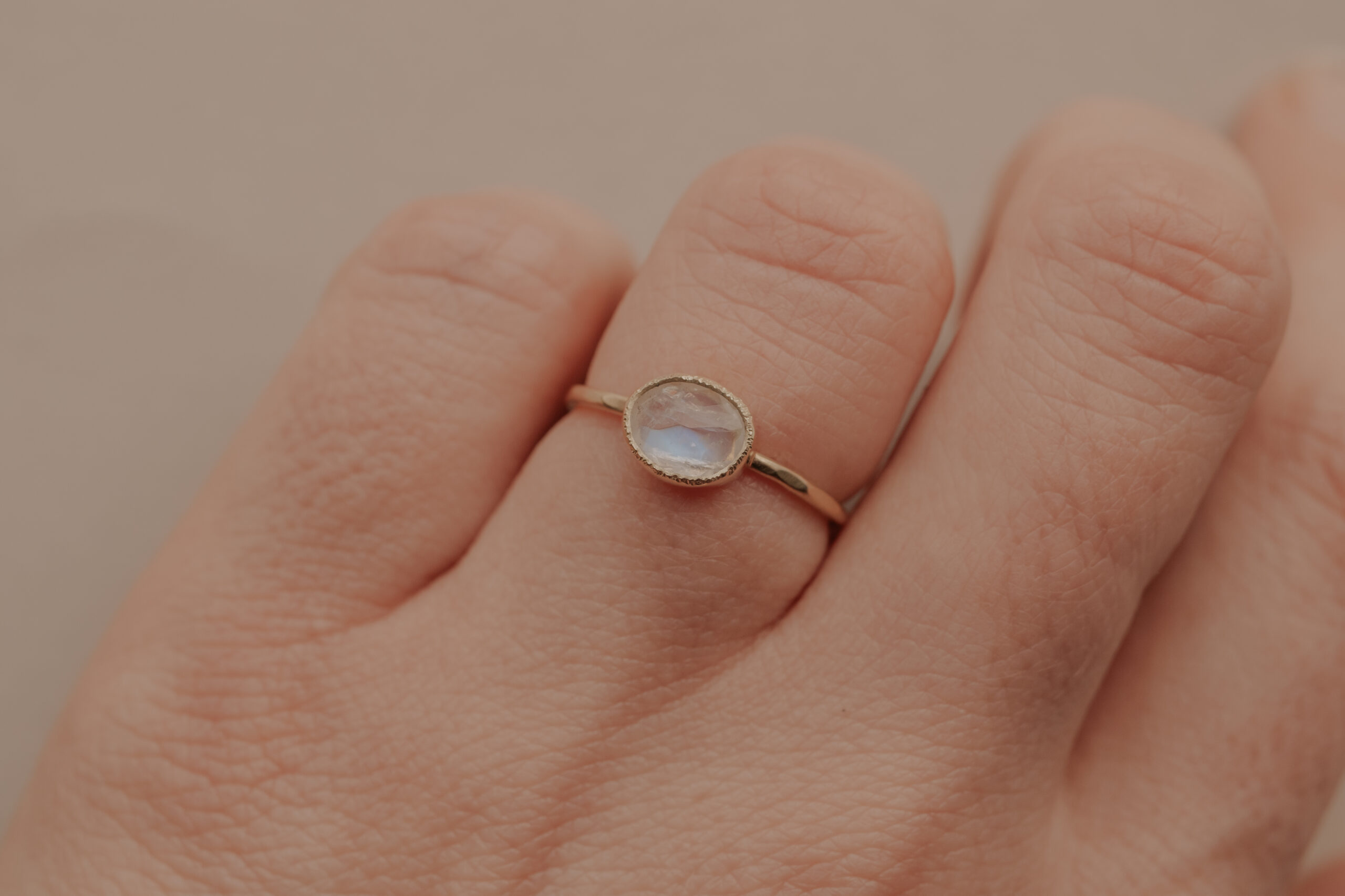 Deze 14 karaat geelgouden ring is met een dikte van 1.2 mm, een fijner ringetje. De ring is verrijkt met een roos geslepen maansteen van ongeveer 7.8 x 6.5 mm.