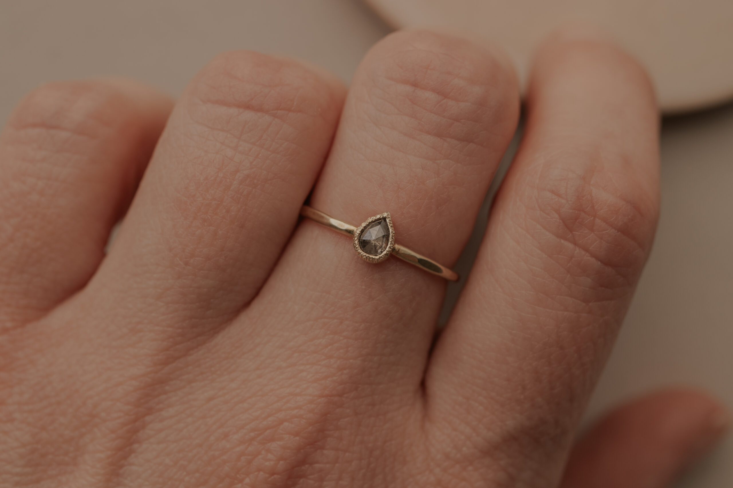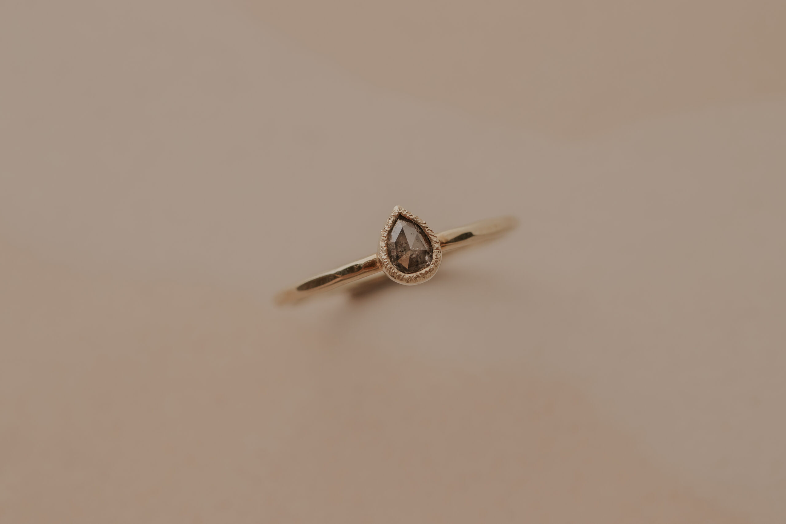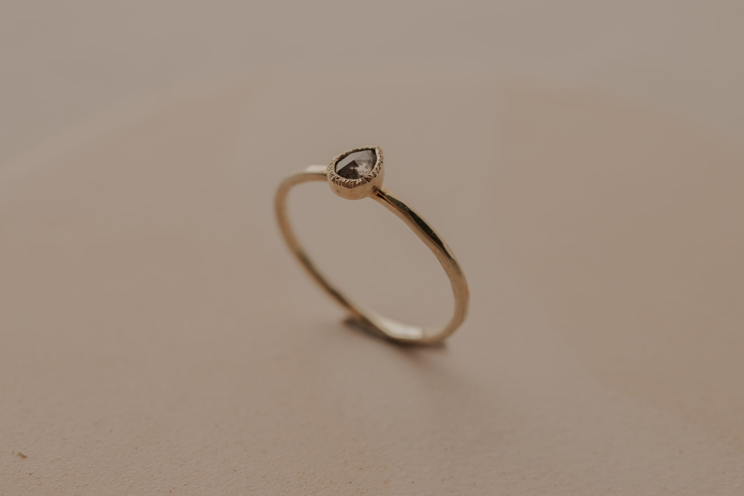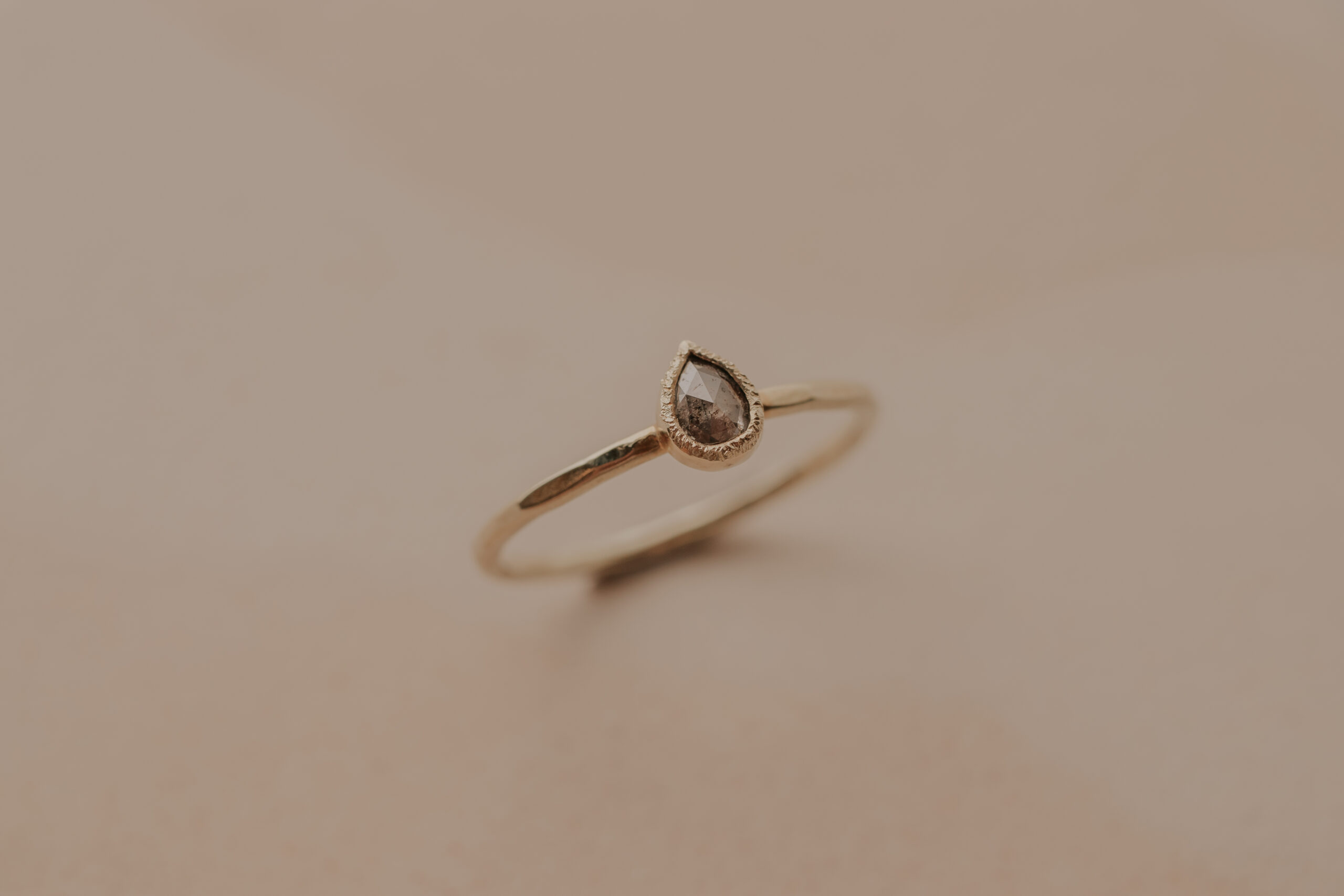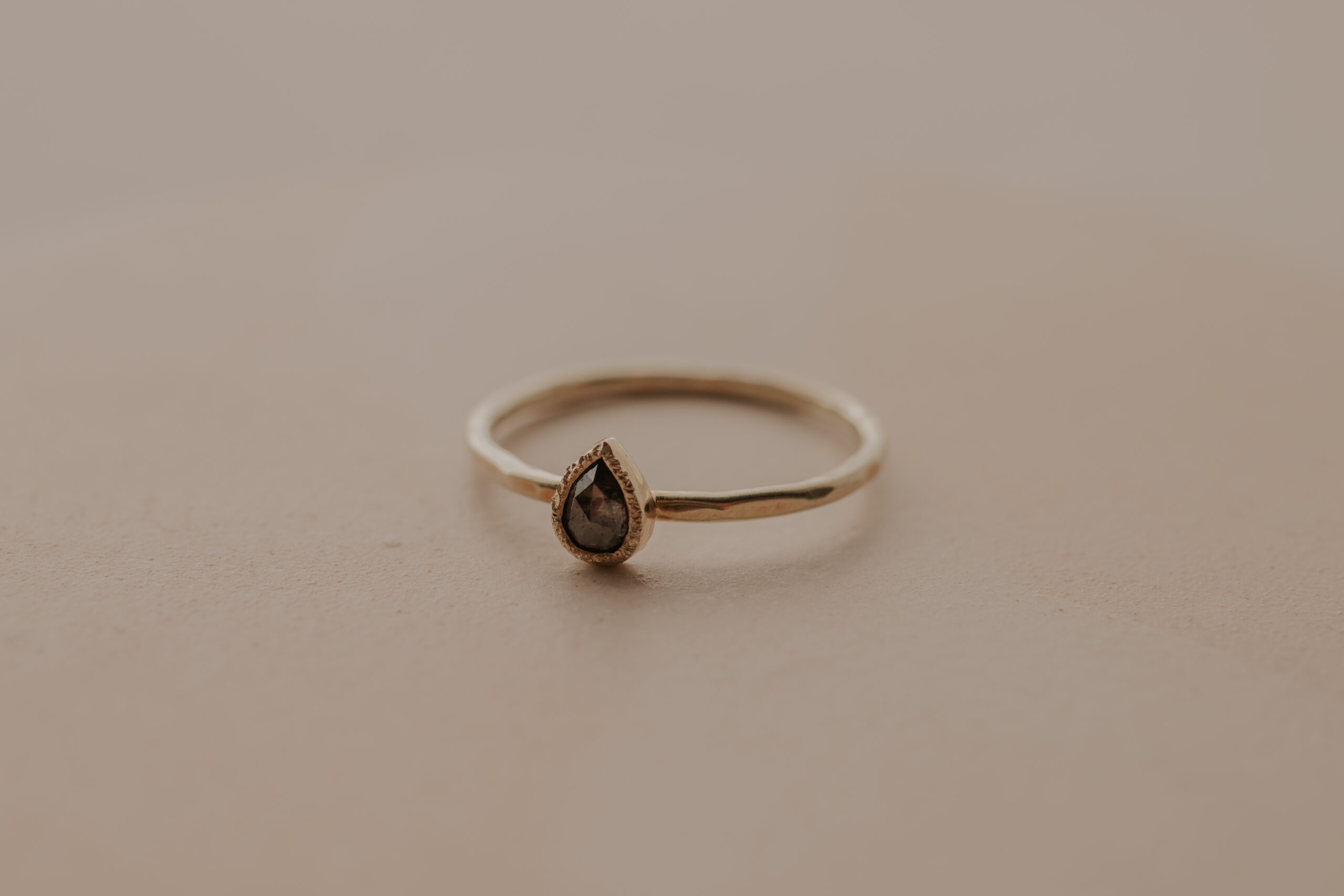 Deze 14 karaat geelgouden ring heeft een dikte van 1.4 mm. De ring is verrijkt met een bruine, druppelgeslepen diamant van 5.55 x 4.4 mm, gezet in een gehamerd zetkastje. De ring heeft een organische hamerslag en een satijnen finish.