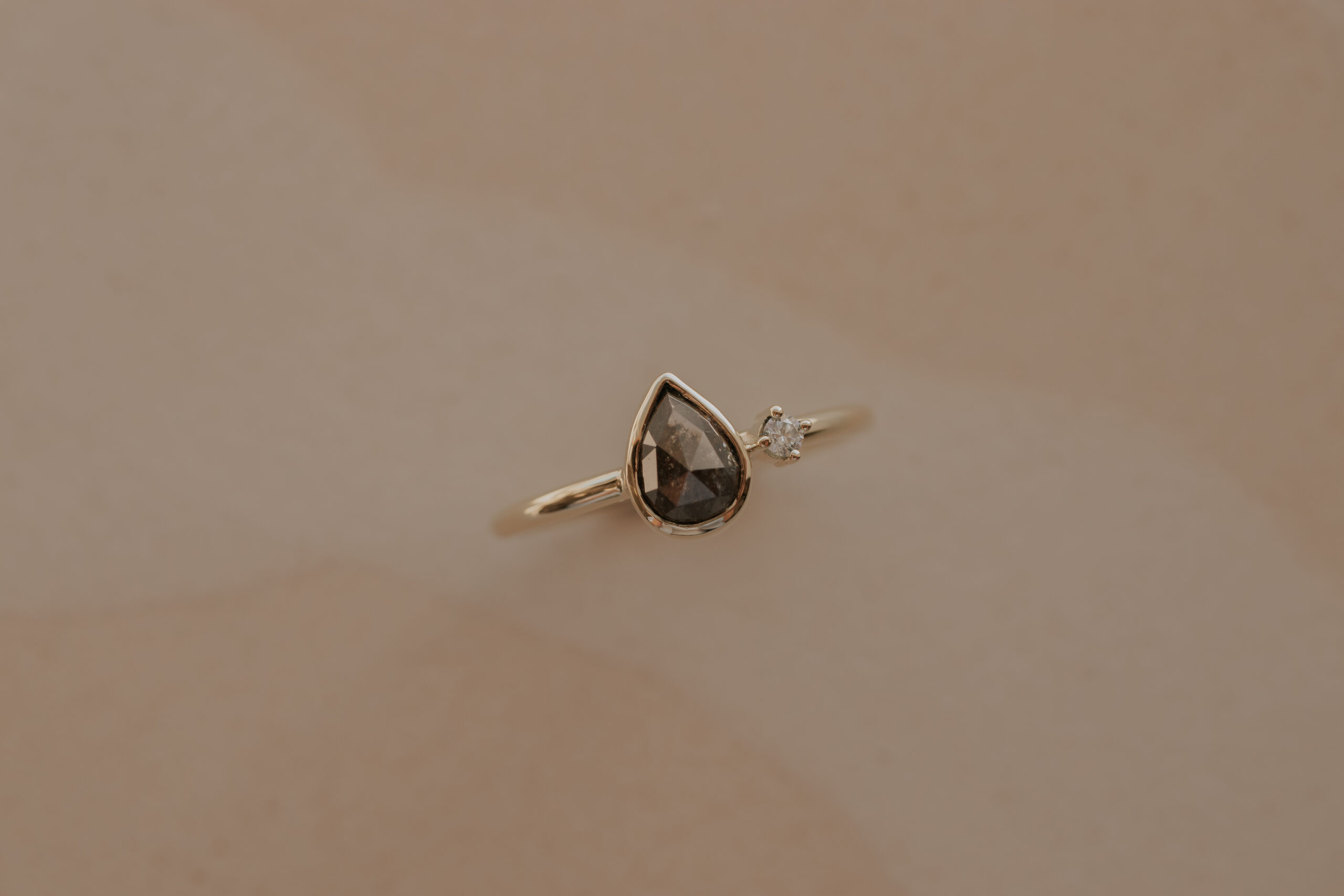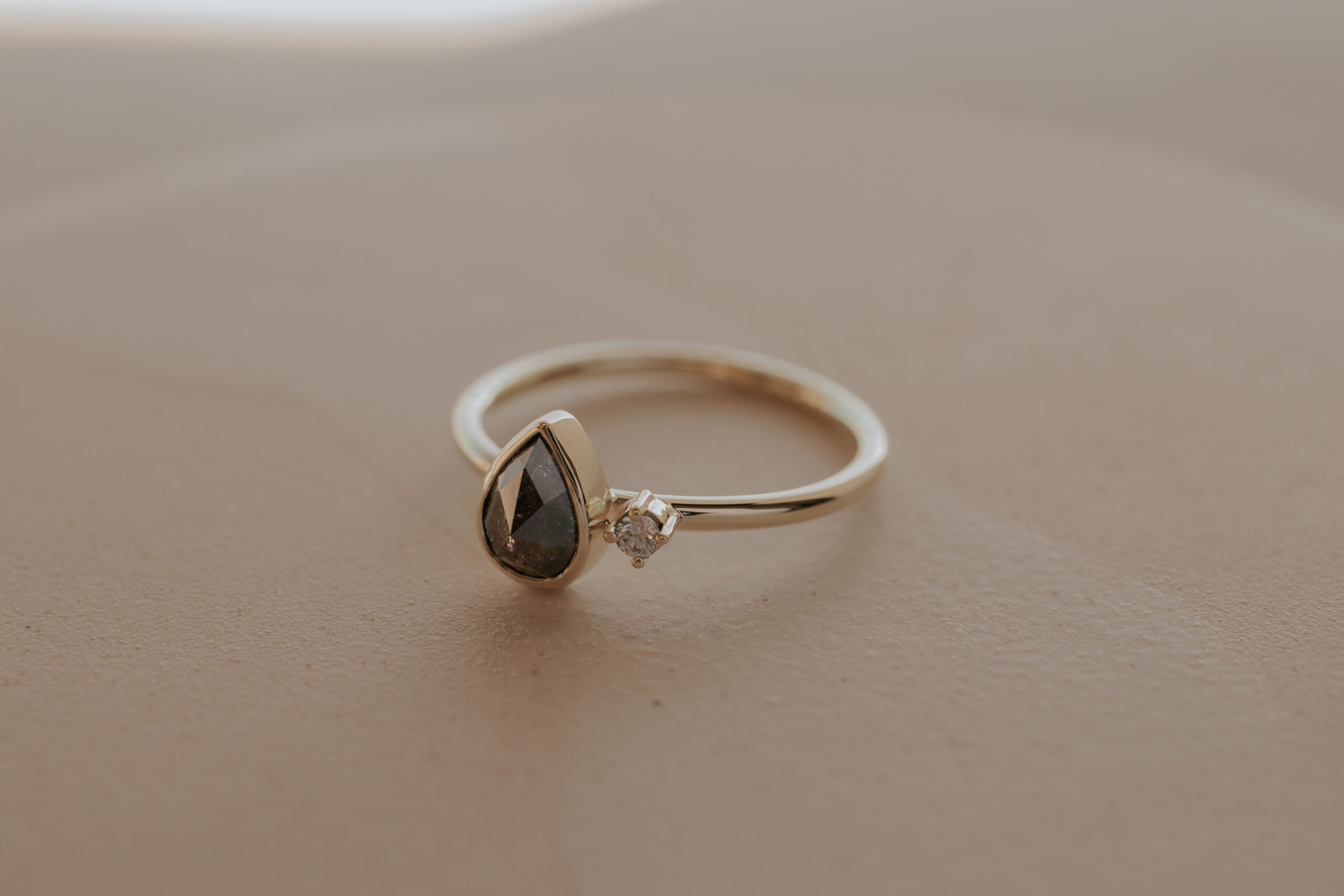 Deze 14 karaat geelgouden ring heeft een dikte van 1.6 mm. De ring is verrijkt met een druppel vormige salt & pepper diamant van 6.91 x 4.97 x 3.28 mm, gezet in een zetkastje met aan de zijkant van de zetkast een 2 mm (0.035 karaat) SI briljant in een chaton zetting. De ring is glad afgewerkt en heeft een glanzende finish.