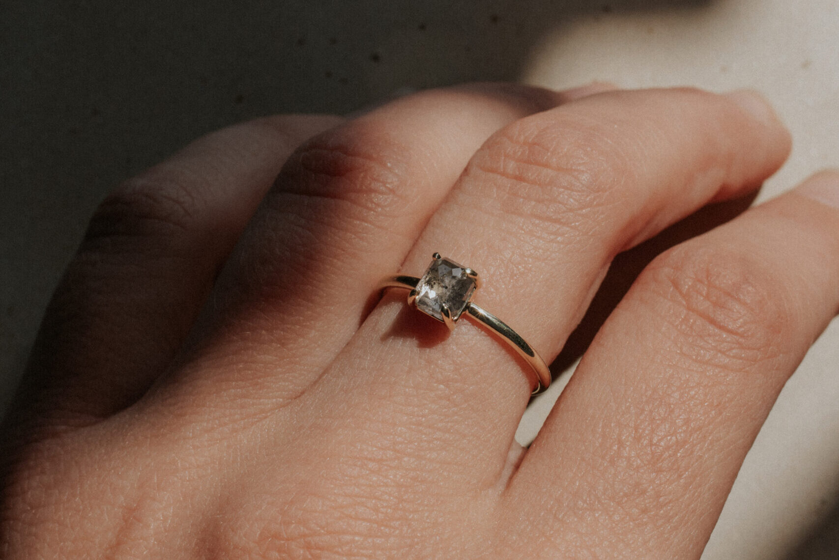 The ringband of this 14k gold ring is 1.5 mm thick. This ring has a light salt & pepper diamond in emerald shape, that is set in a prong setting. The 0.73 carat diamond measures 5.3 x 4.2 x 2.7 mm.