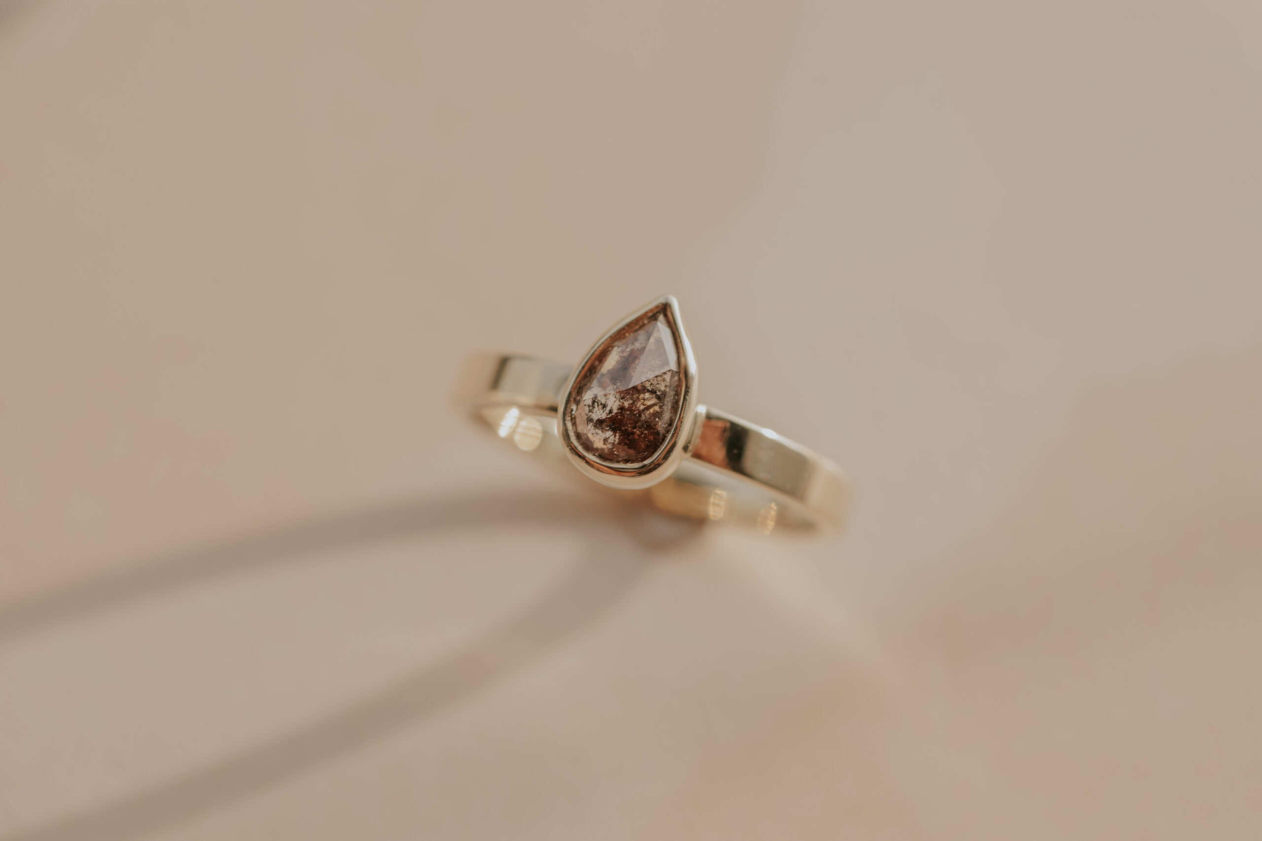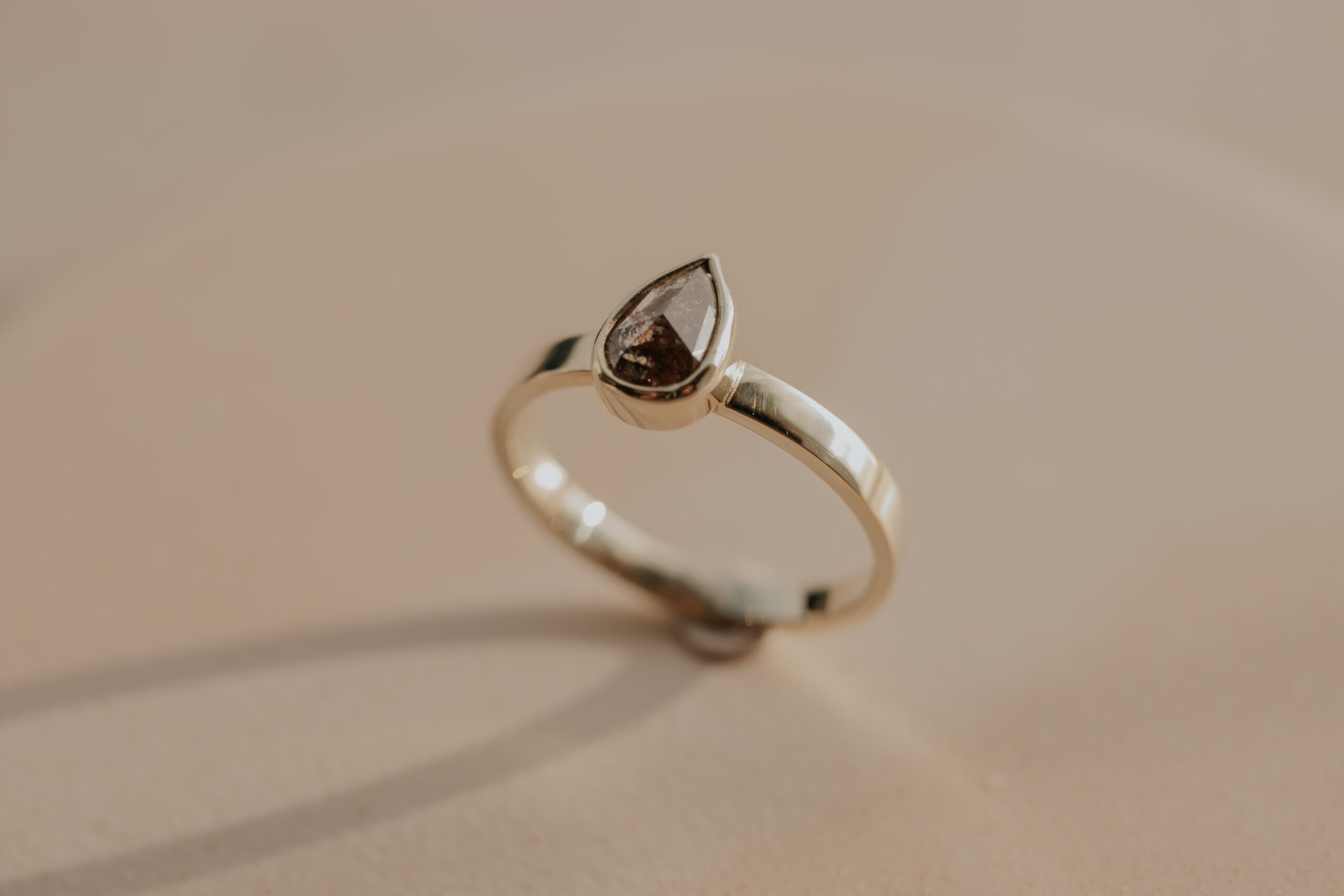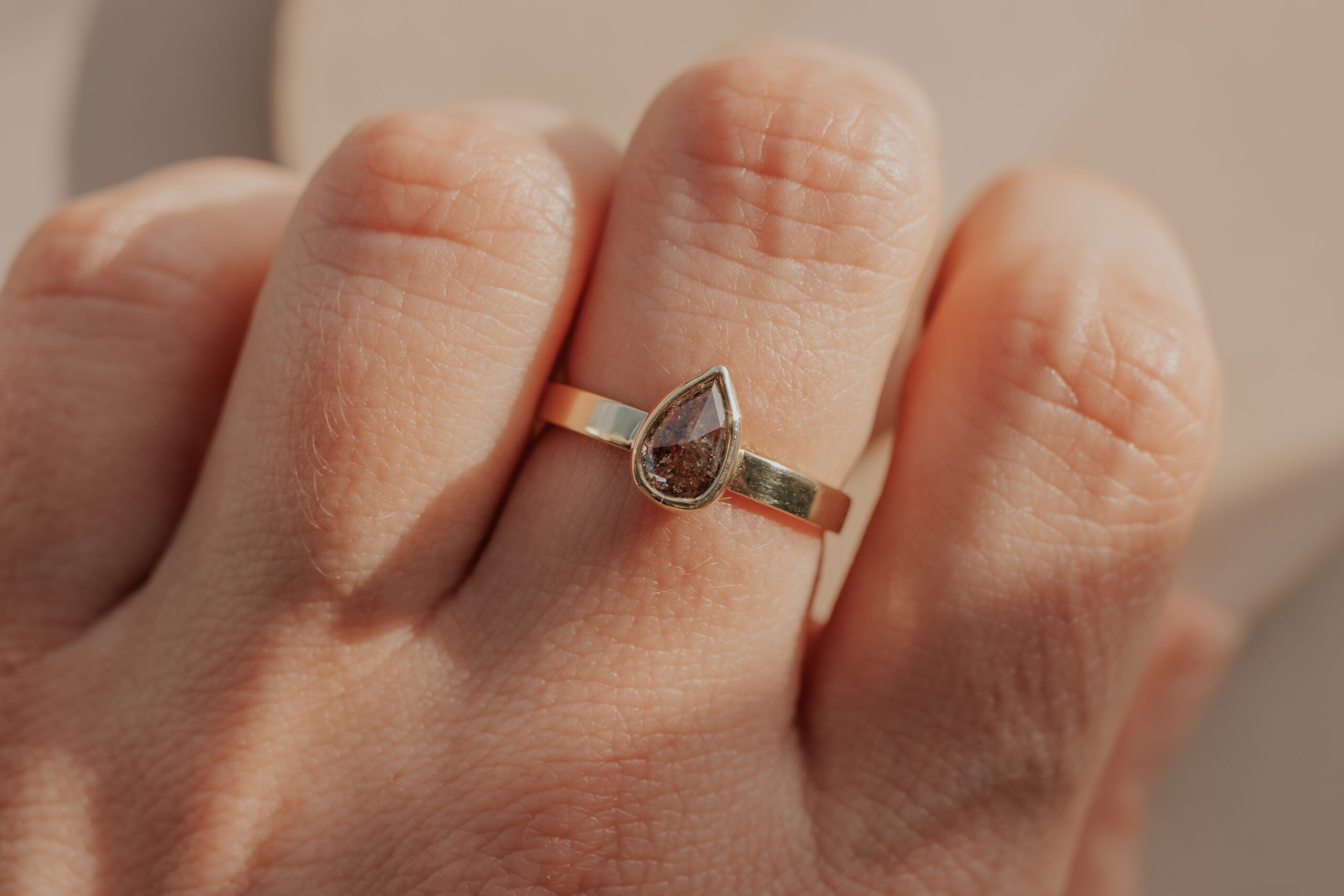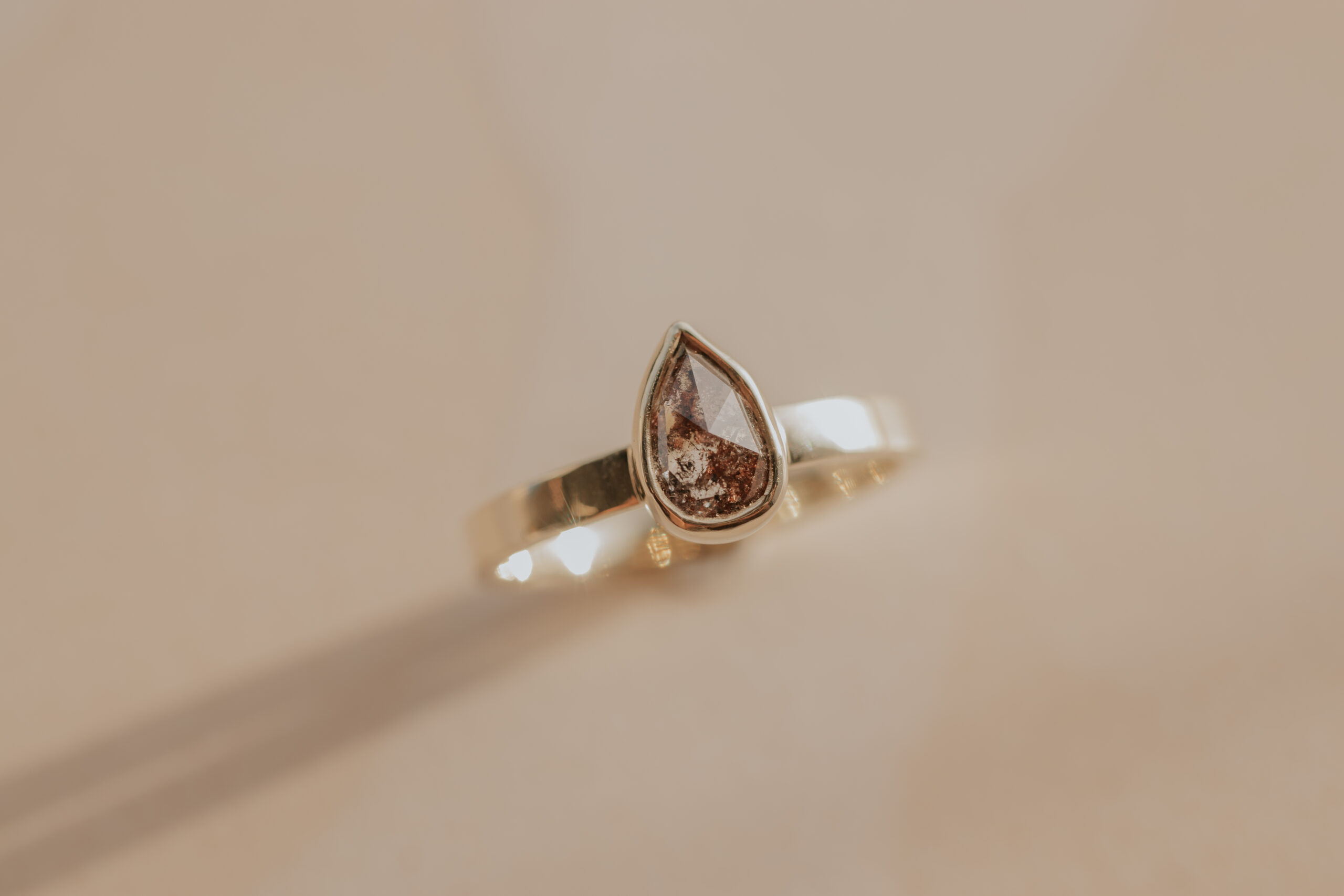 Deze 14 karaat geelgouden ring heeft een breedte van 2.5 mm en een dikte van 1.2 mm. De ring is verrijkt met een bruine, druppelgeslepen ‘salt and pepper’ diamant van 7.8 x 5.1 mm, gezet in een zetkastje. De ring is glad afgewerkt en heeft een glanzende finish.