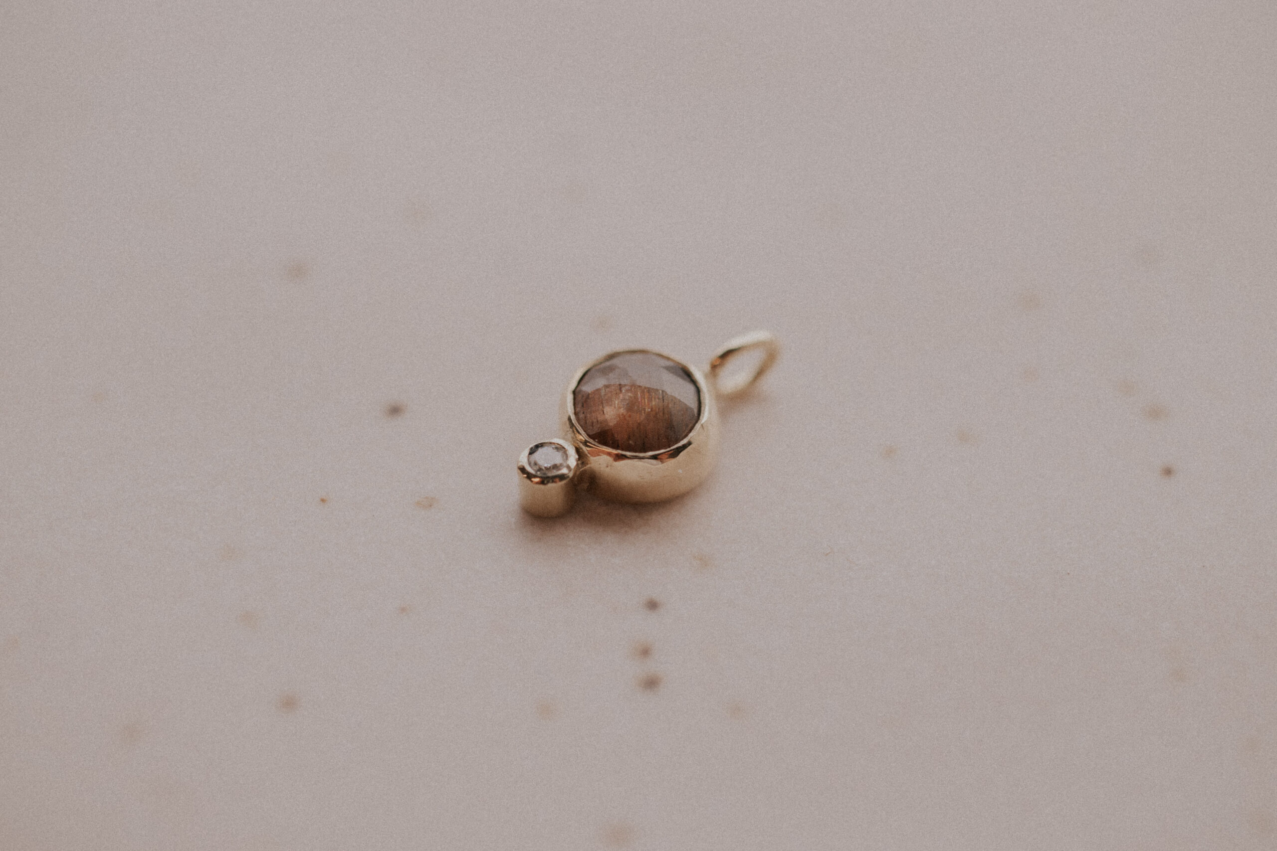 Deze bedel bevat een rooster zonnesteen van ongeveer 6 mm, gezet in een gouden kastje, en een 2 mm moissaniet in een tube zetting. Het ringetje van deze bedel is qua grootte geschikt om zelf aan onze kettingen te rijgen. Heb je al een ketting maar is de sluiting te groot voor het ringetje van de bedel? Dan kunnen wij in het atelier kosteloos de bedel aan jouw eigen ketting zetten.