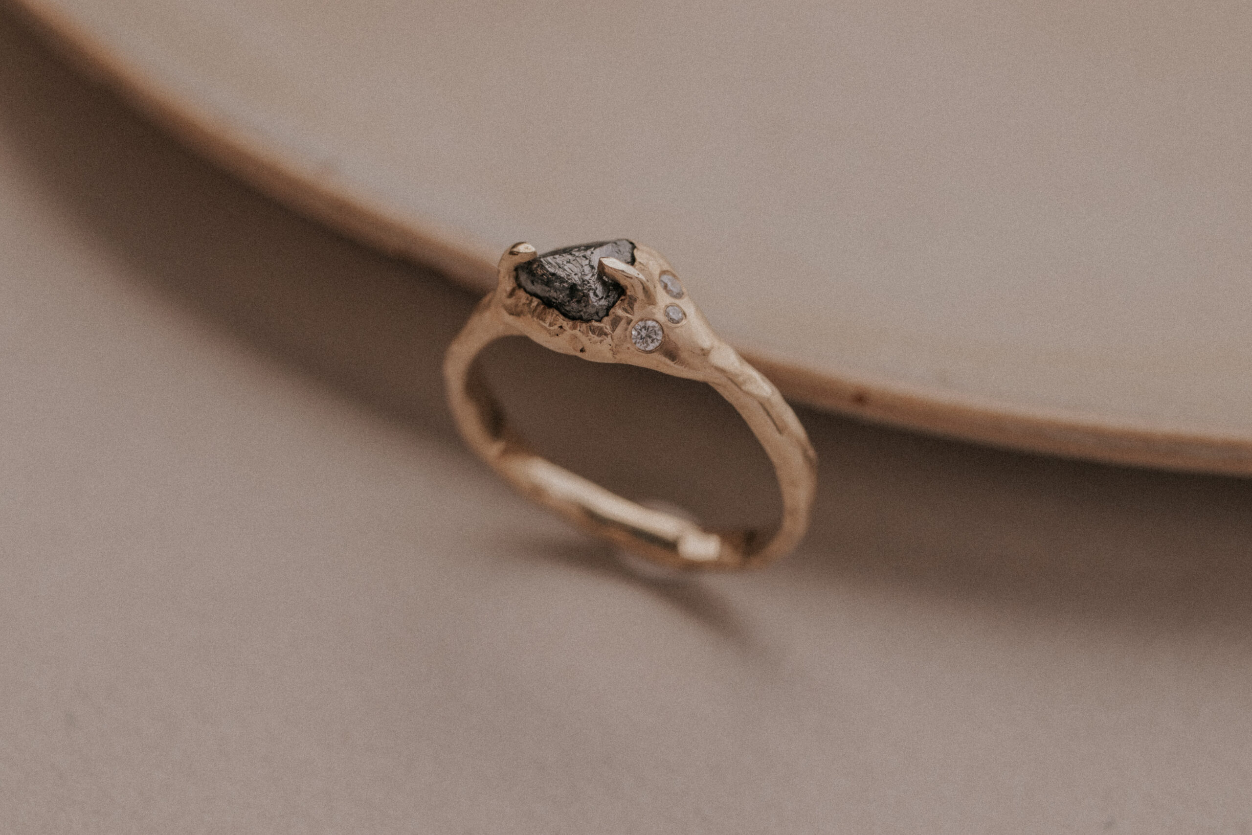 The grey, raw diamond that is incorporated into this ring is about 5 mm. Next to the raw diamond, three clear SIH quality diamonds are incorporated into the ring – which measure 2 x 1.5 mm and 1 x 0.9 mm.