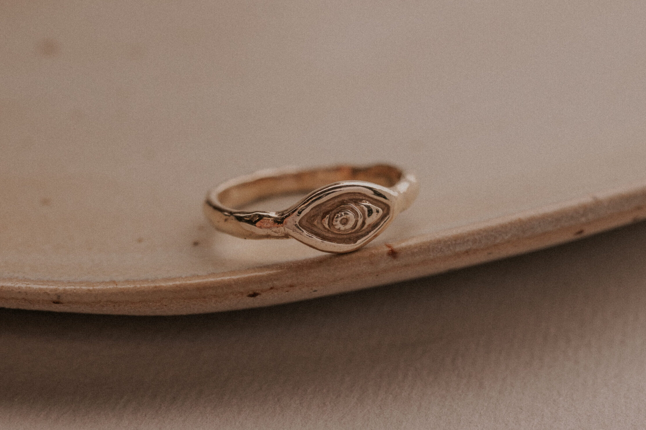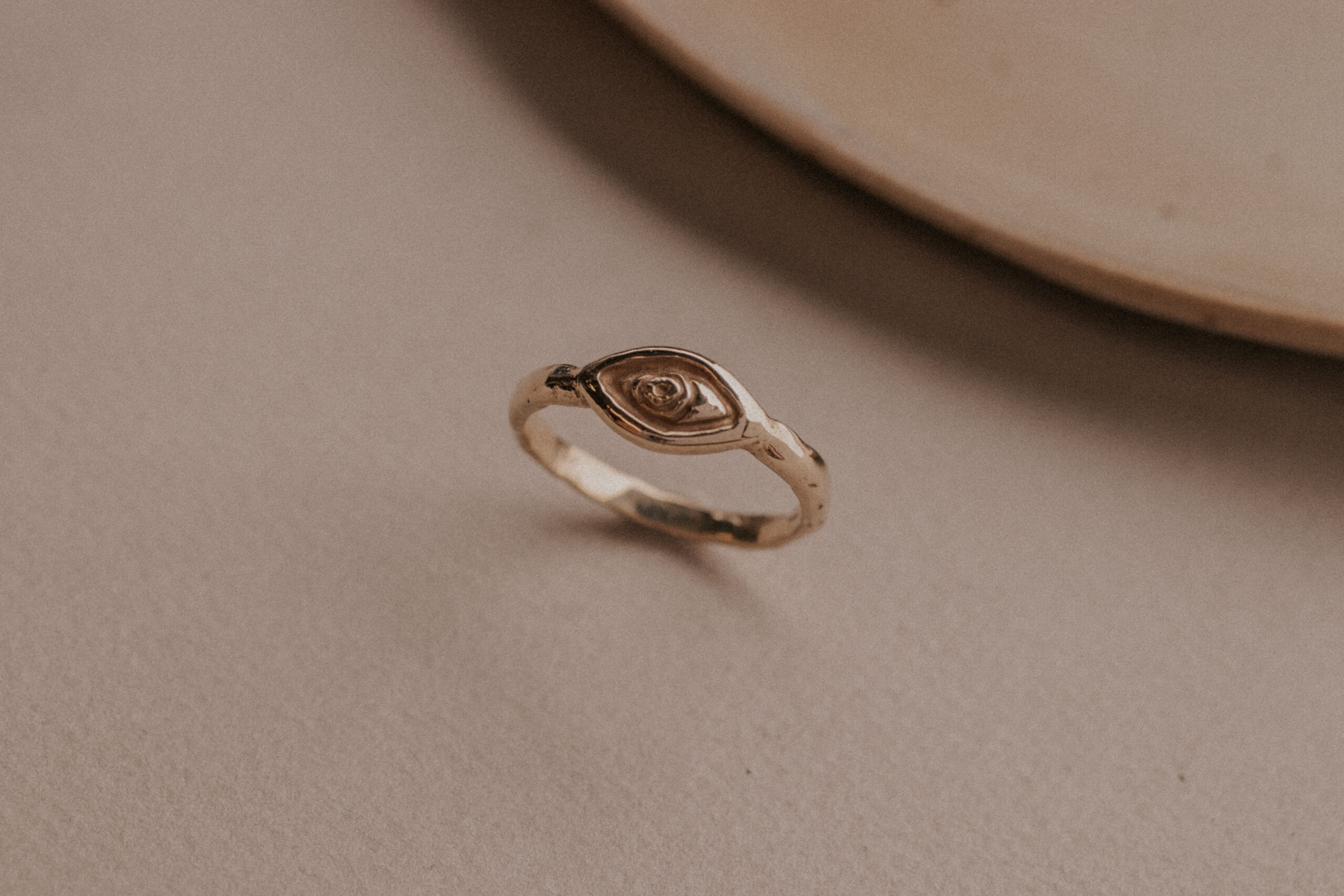 Each ring is handcrafted and always unique and one of a kind. The size of the eye is about 6.3 x 11.5 mm. This jewelry piece is made out of 9 karat gold – and can also be made out of 14 karat gold and in silver.