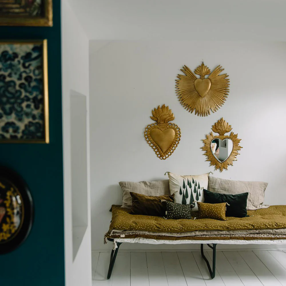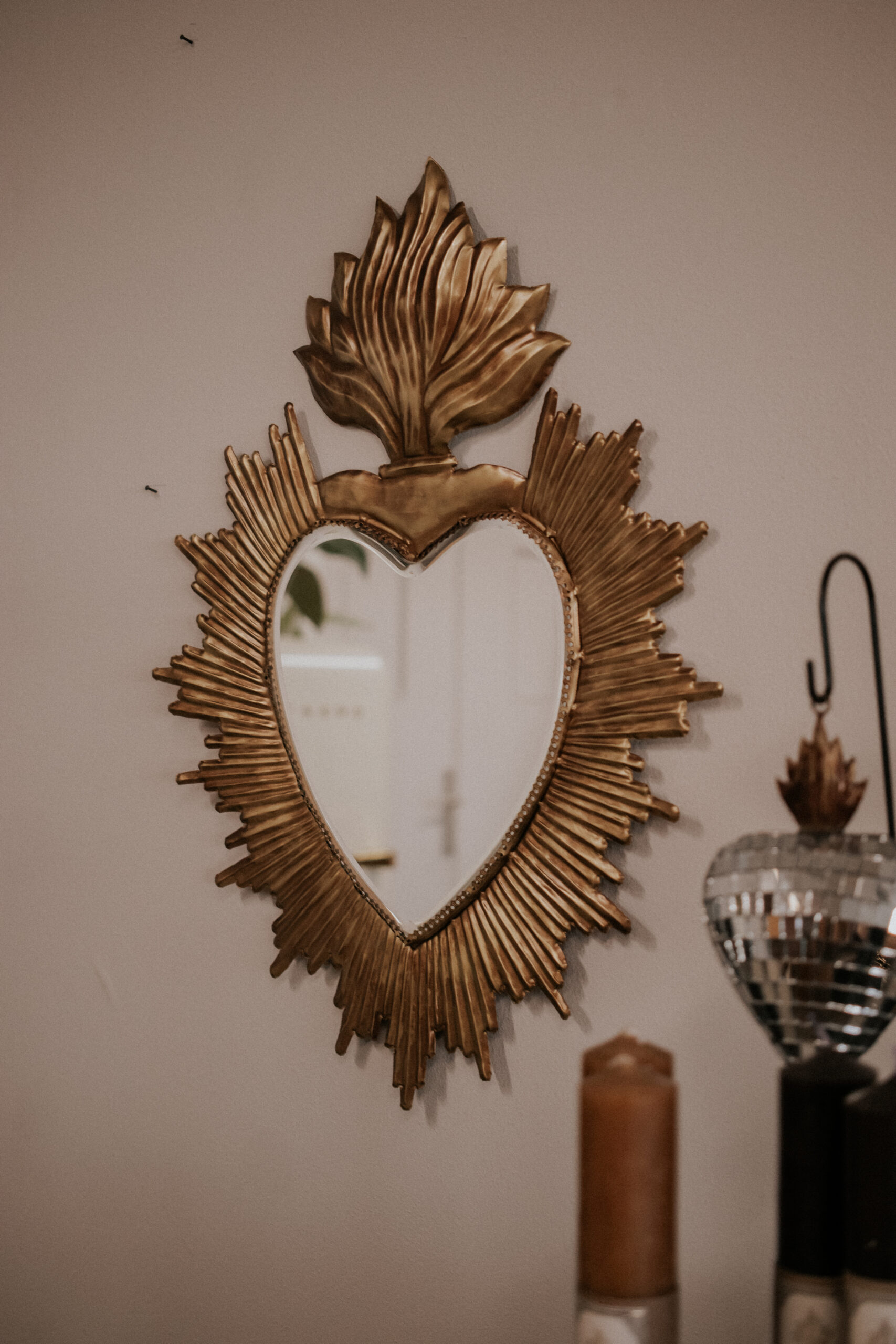 Materiaal: met de hand gepatineerd witmetaal en spiegel