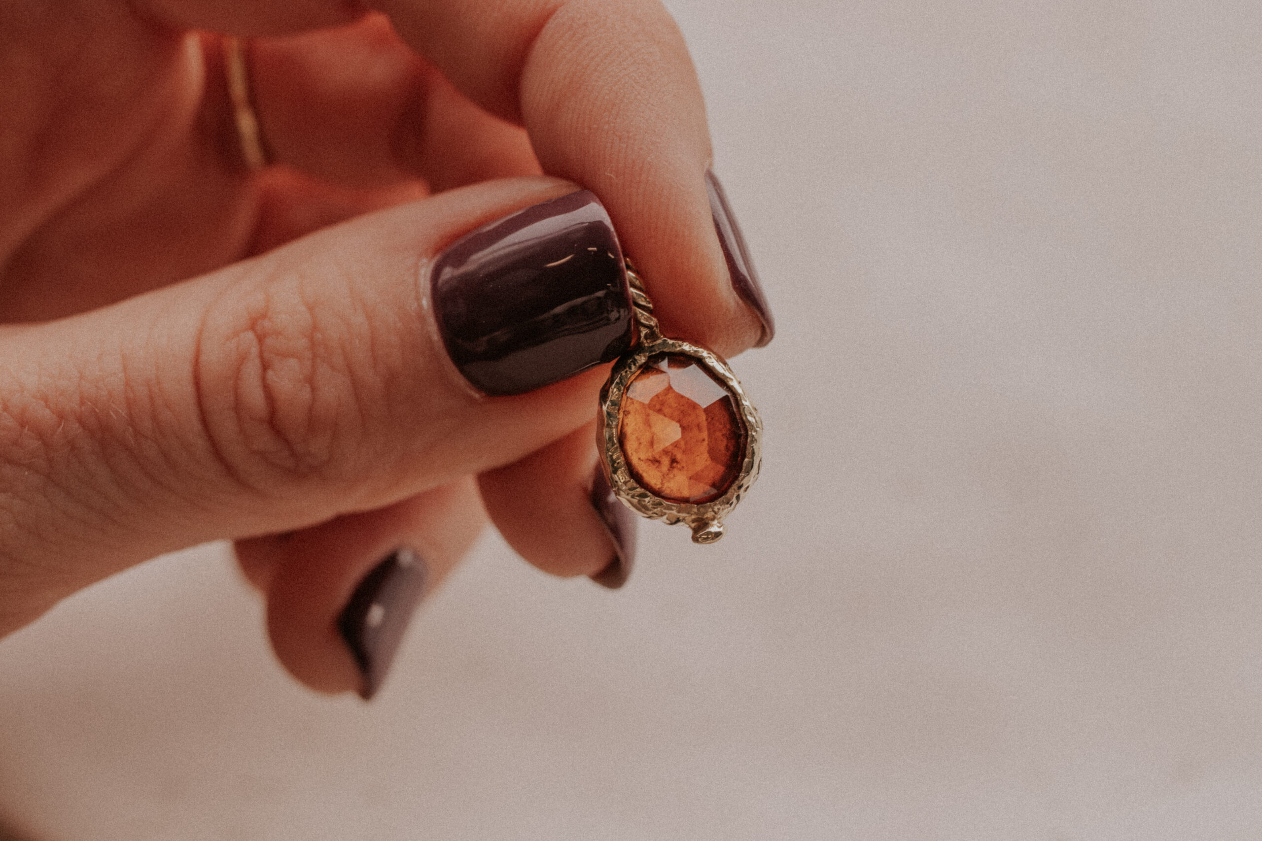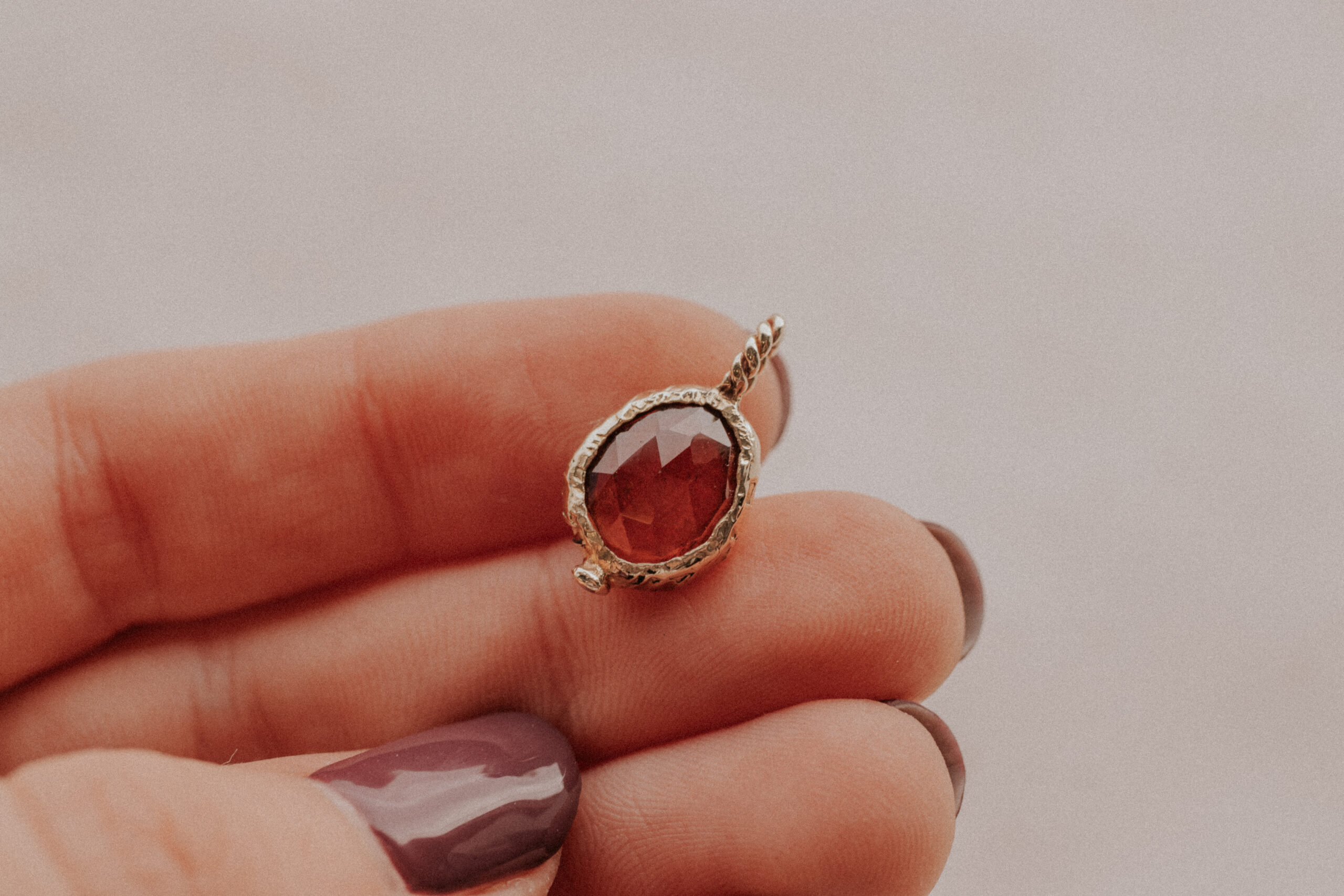Een one of a kind root to rise bedel met hessoniet granaat edelsteen, handgemaakt uit warm goudkleurig brass (messing).