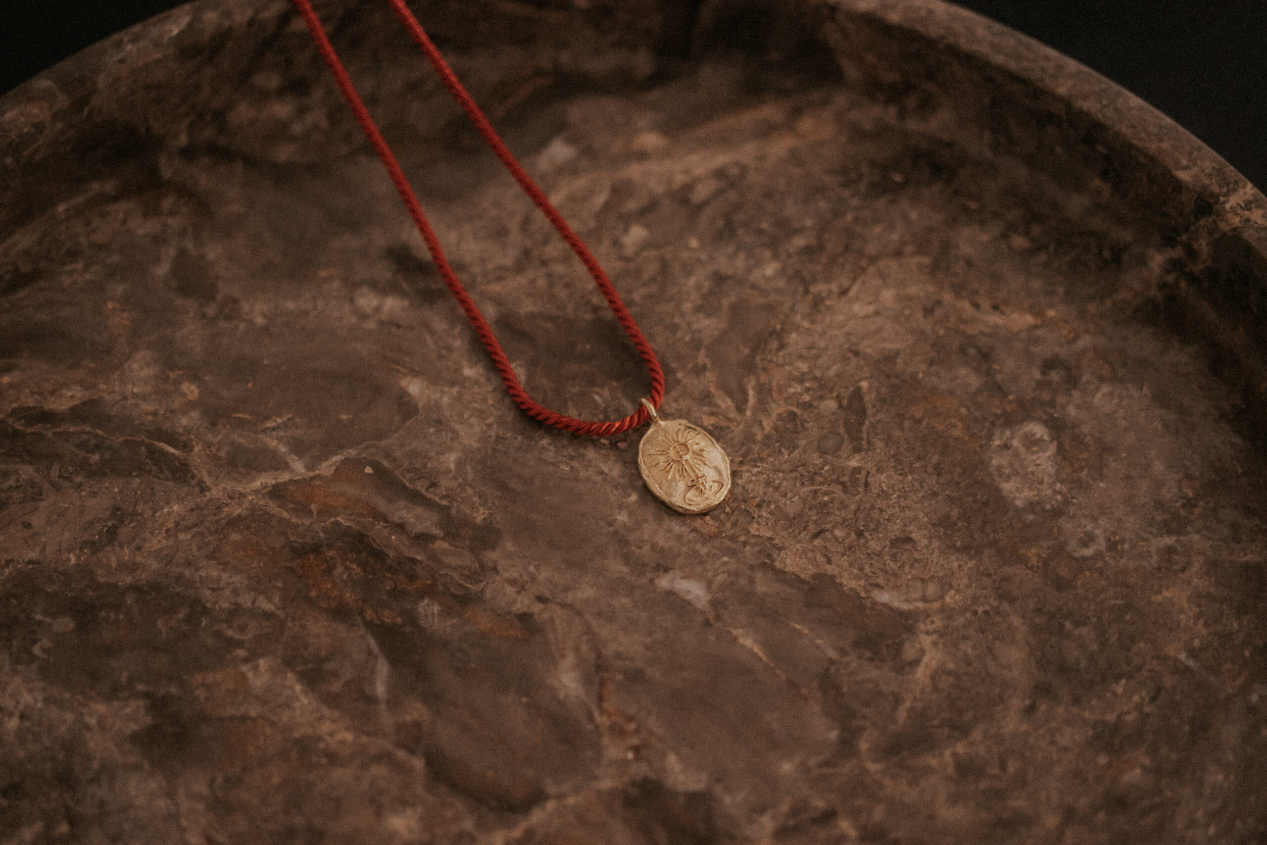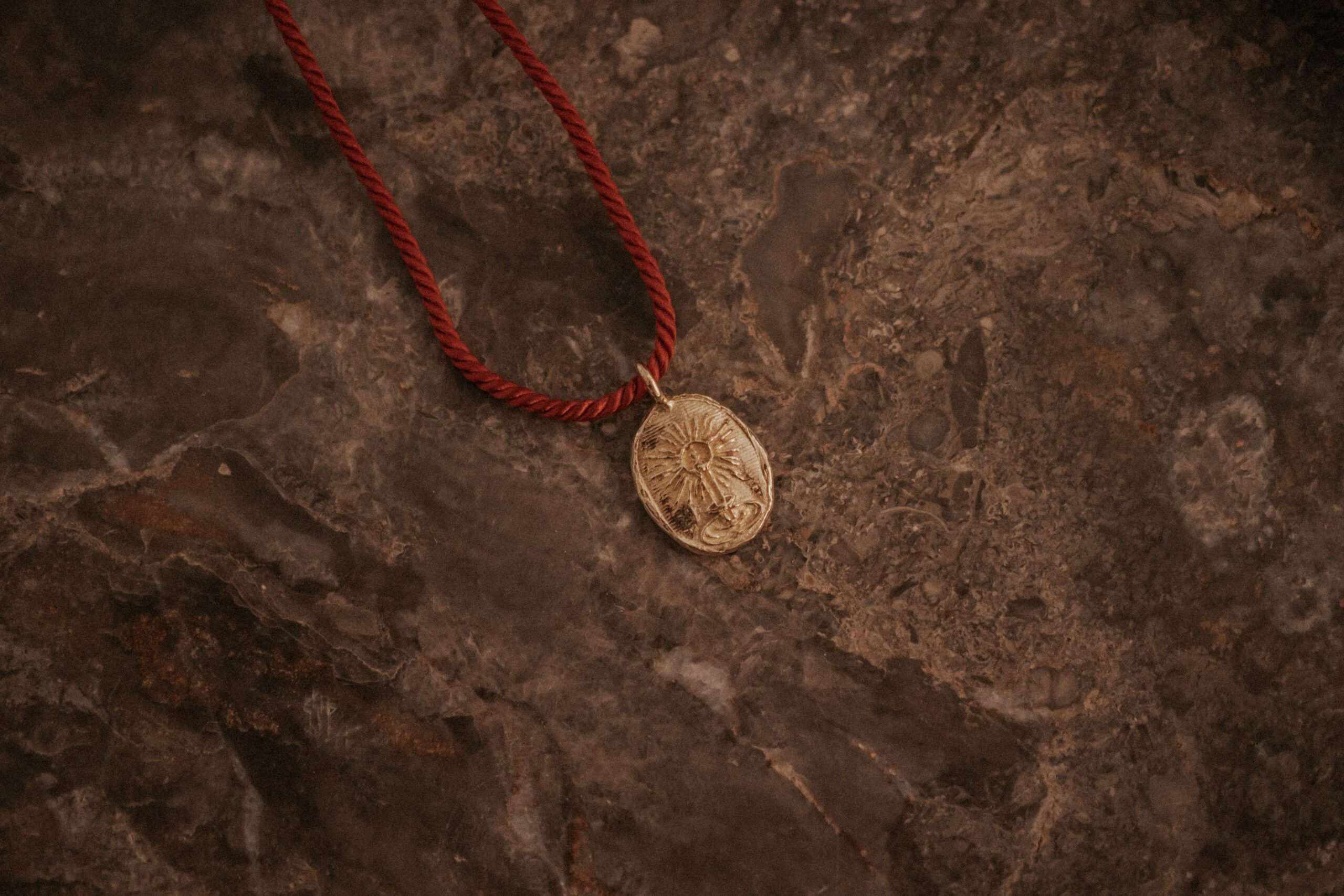 De bedel komt aan een (roest)rood satijnkoord. Het koord maakt het gemakkelijk om de bedel ook aan een andere ketting te dragen.