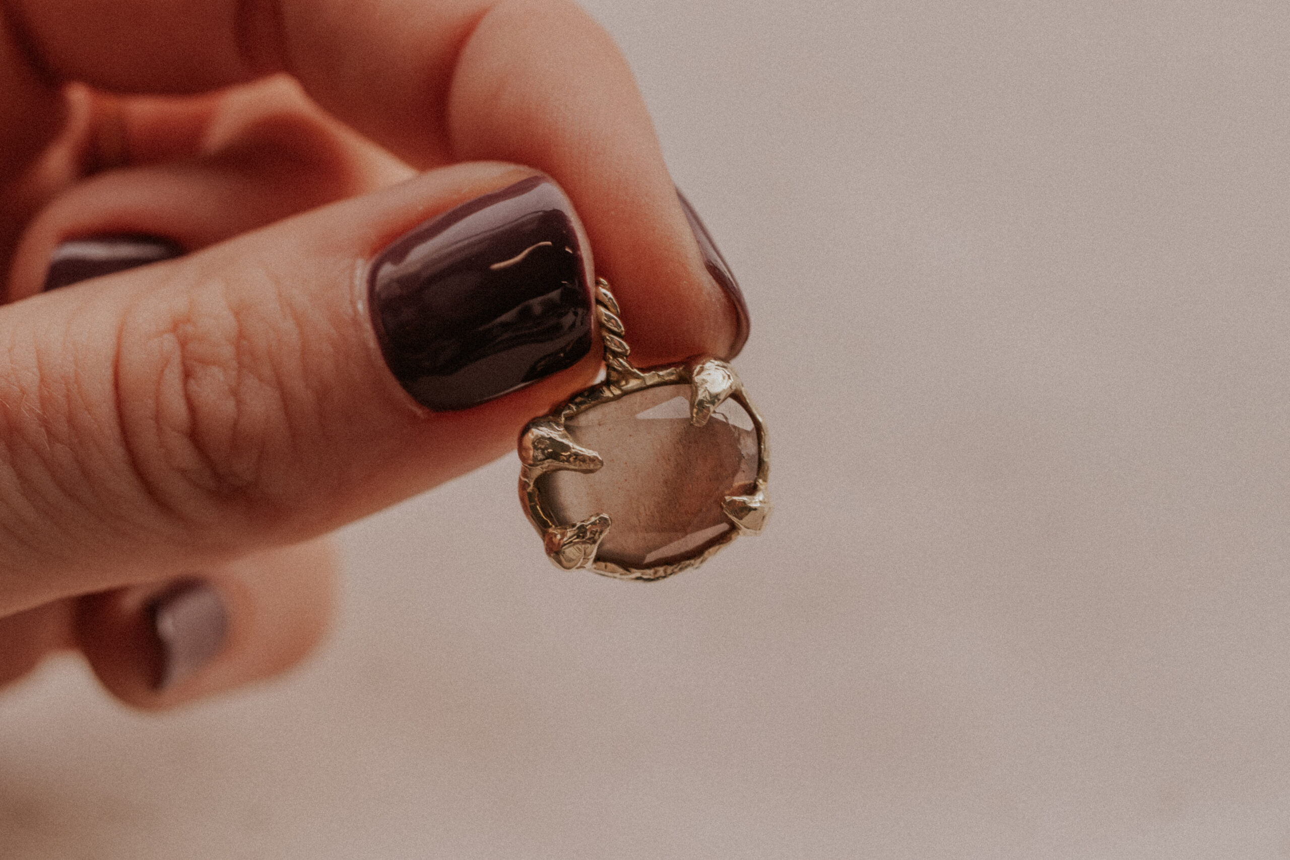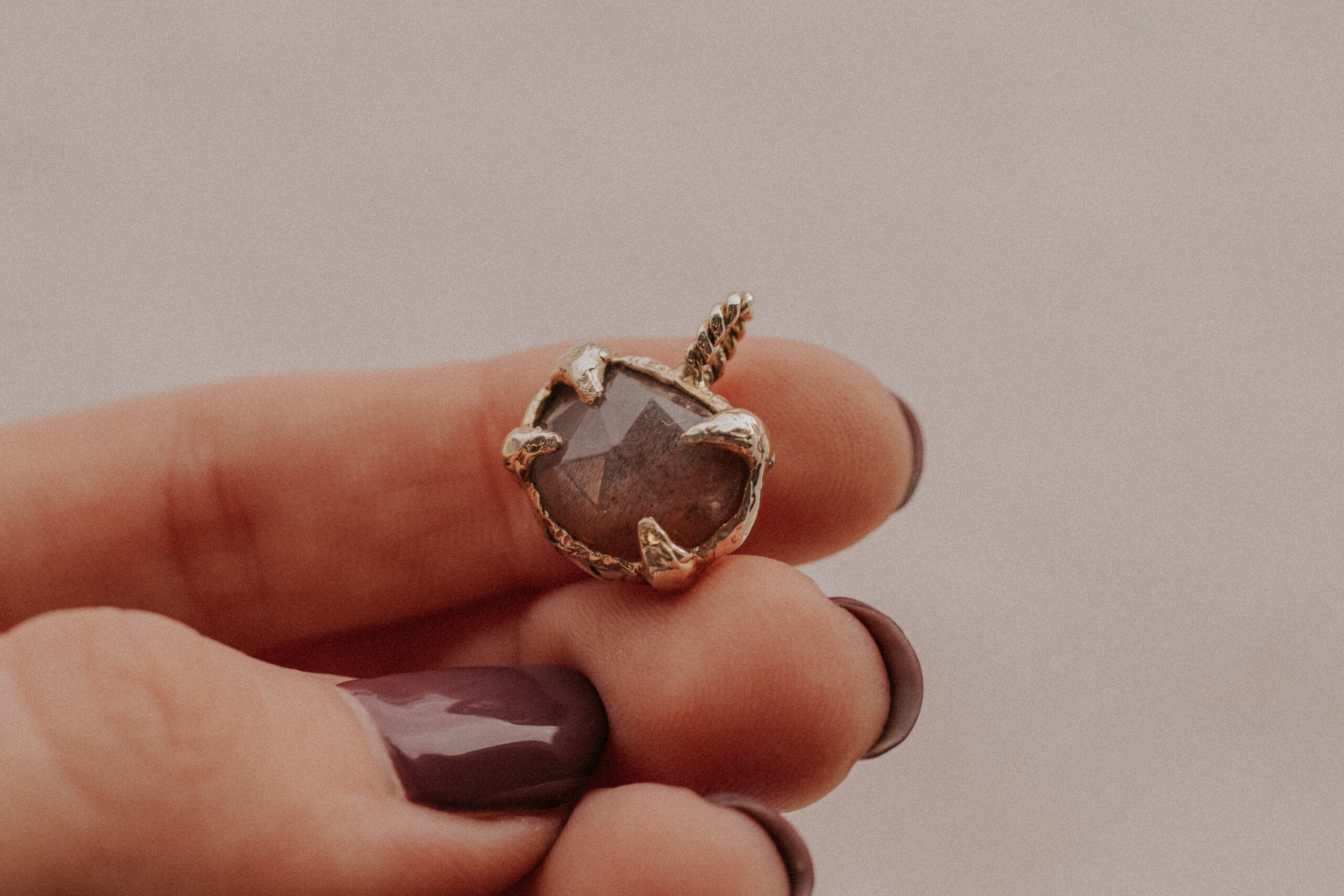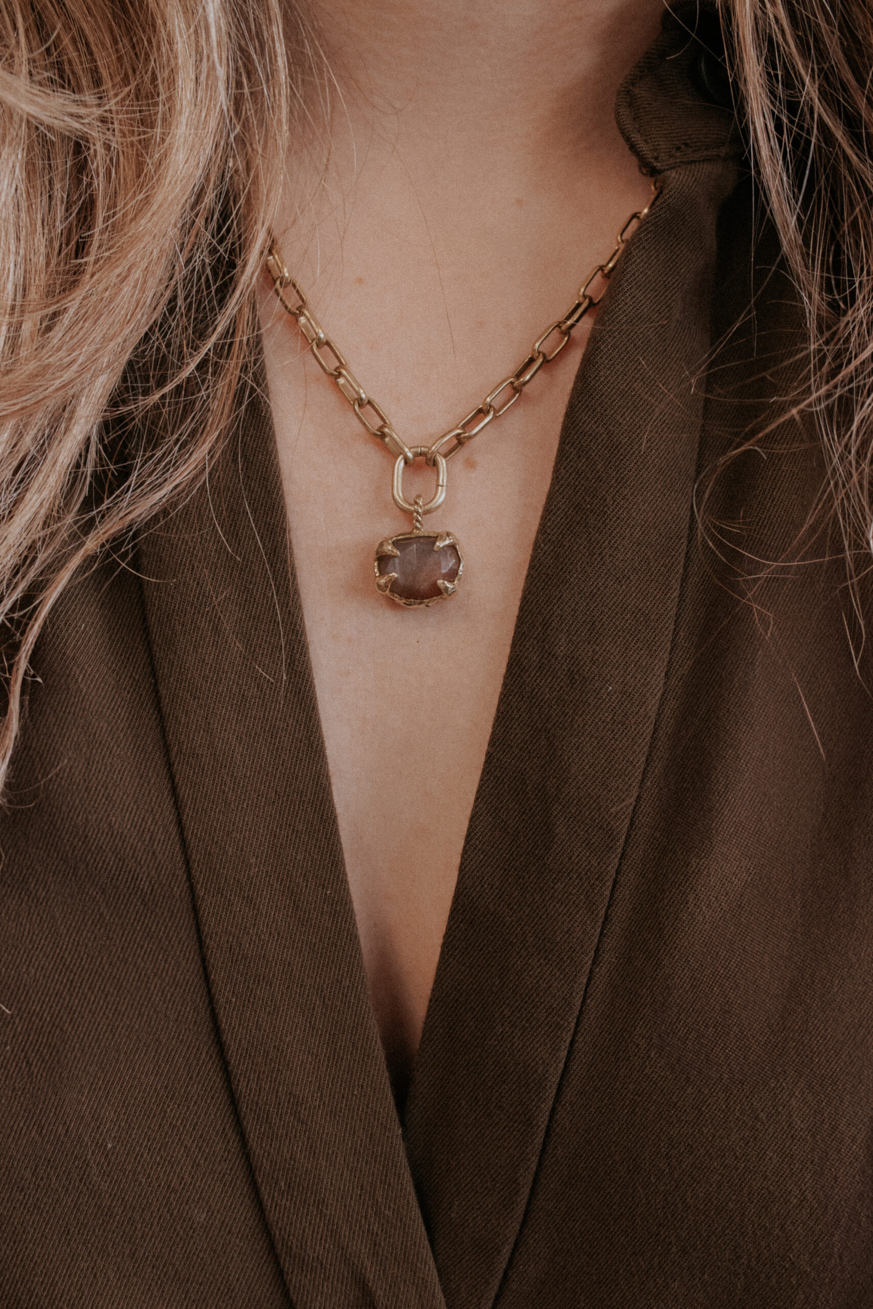 Een one of a kind root to rise bedel met perzik maansteen edelsteen, handgemaakt uit warm goudkleurig brass (messing).