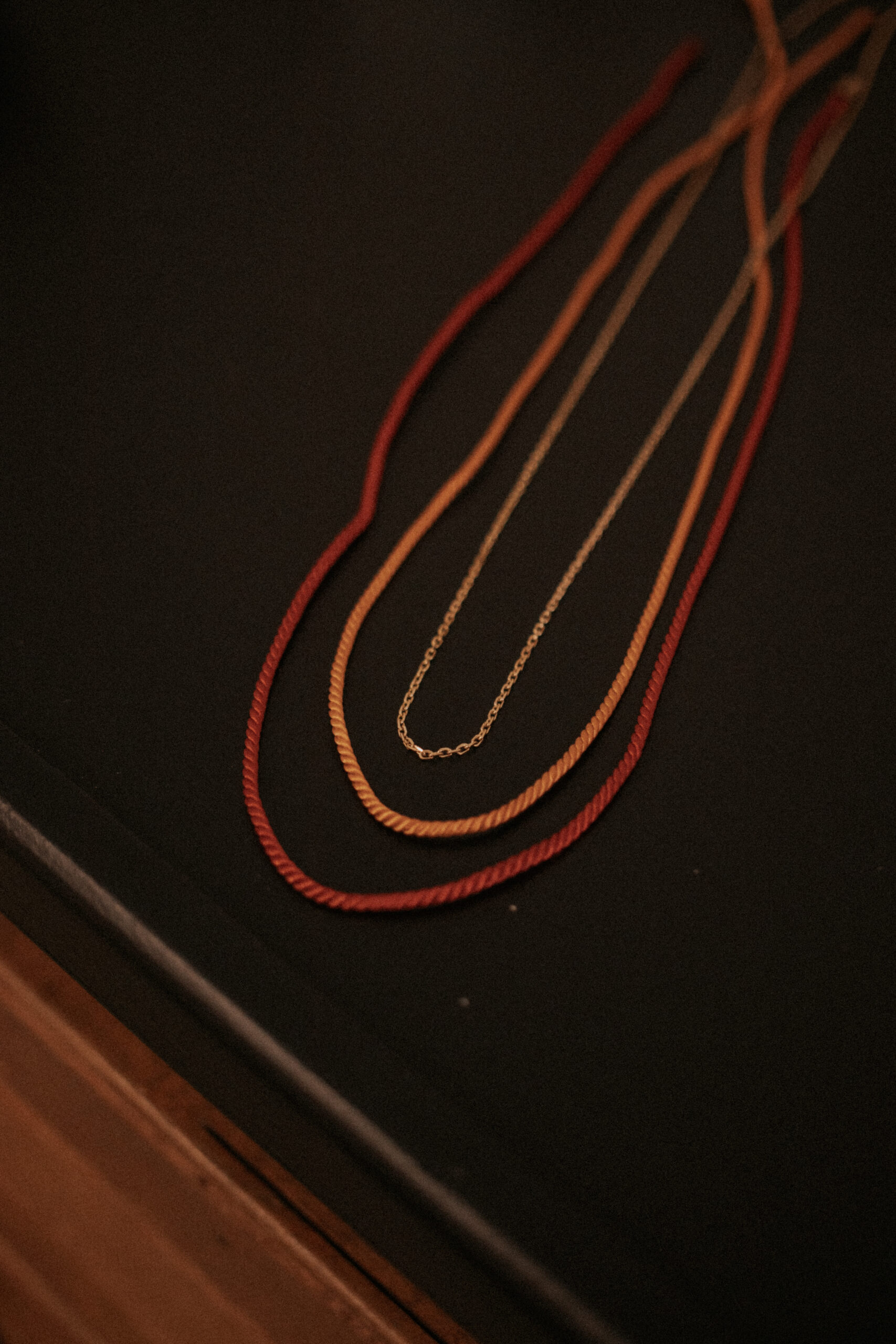 – Satijnkoord in twee kleuren: (roest)rood of perzik. Ideaal als je de bedel ook aan een andere ketting wilt kunnen dragen.
