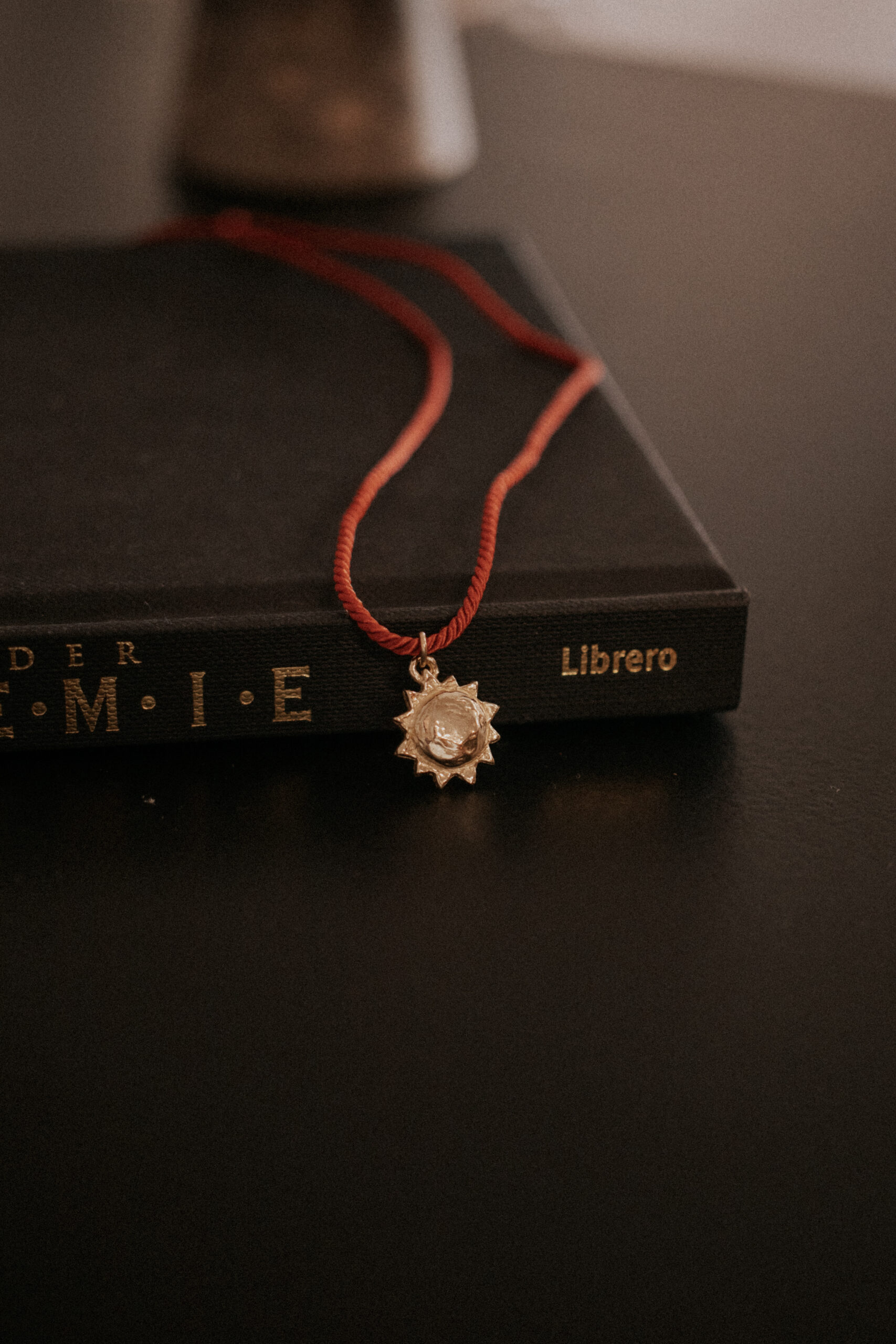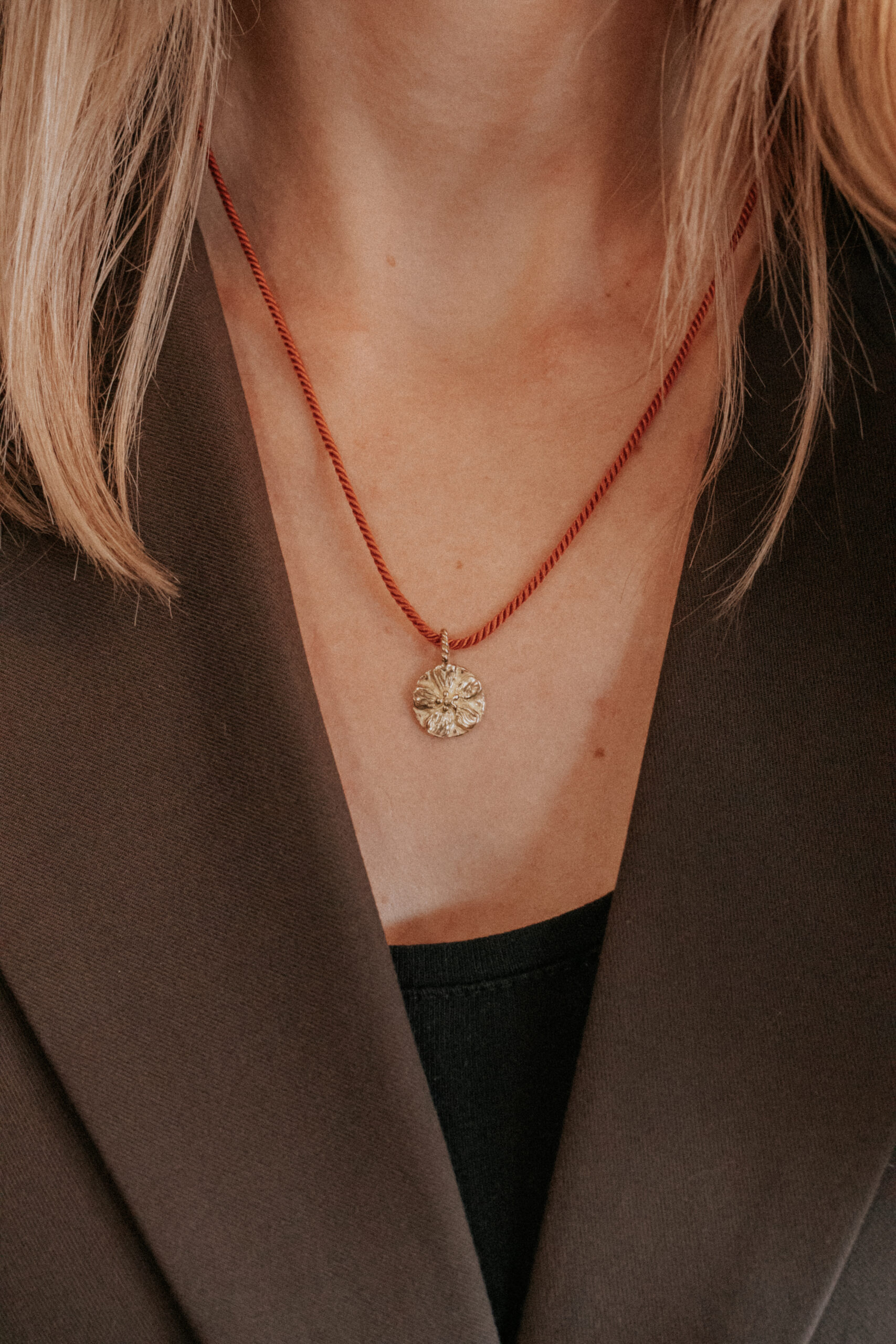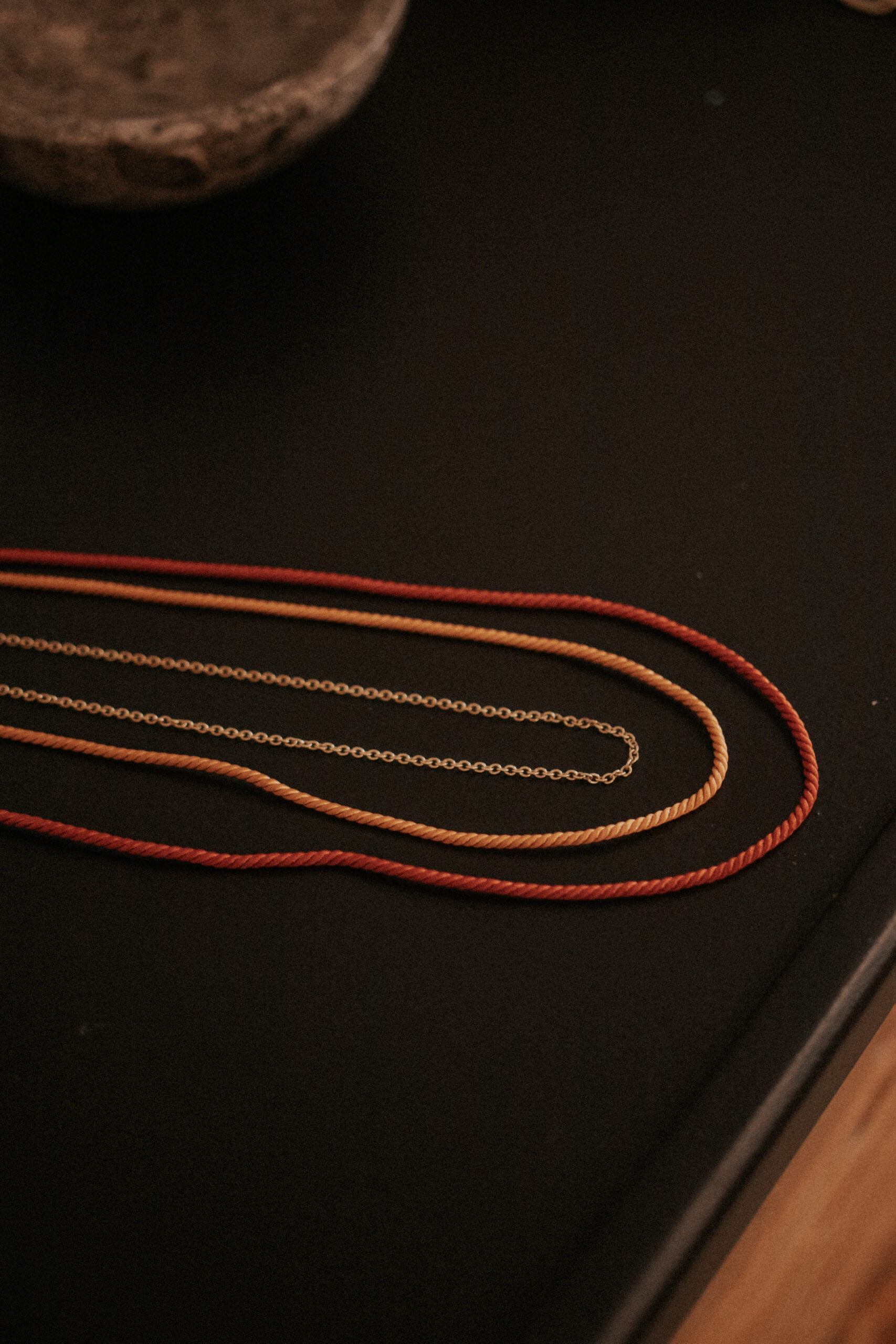 – Satijnkoord in twee kleuren: (roest)rood of perzik. Ideaal als je de bedel ook aan een andere ketting wilt kunnen dragen.