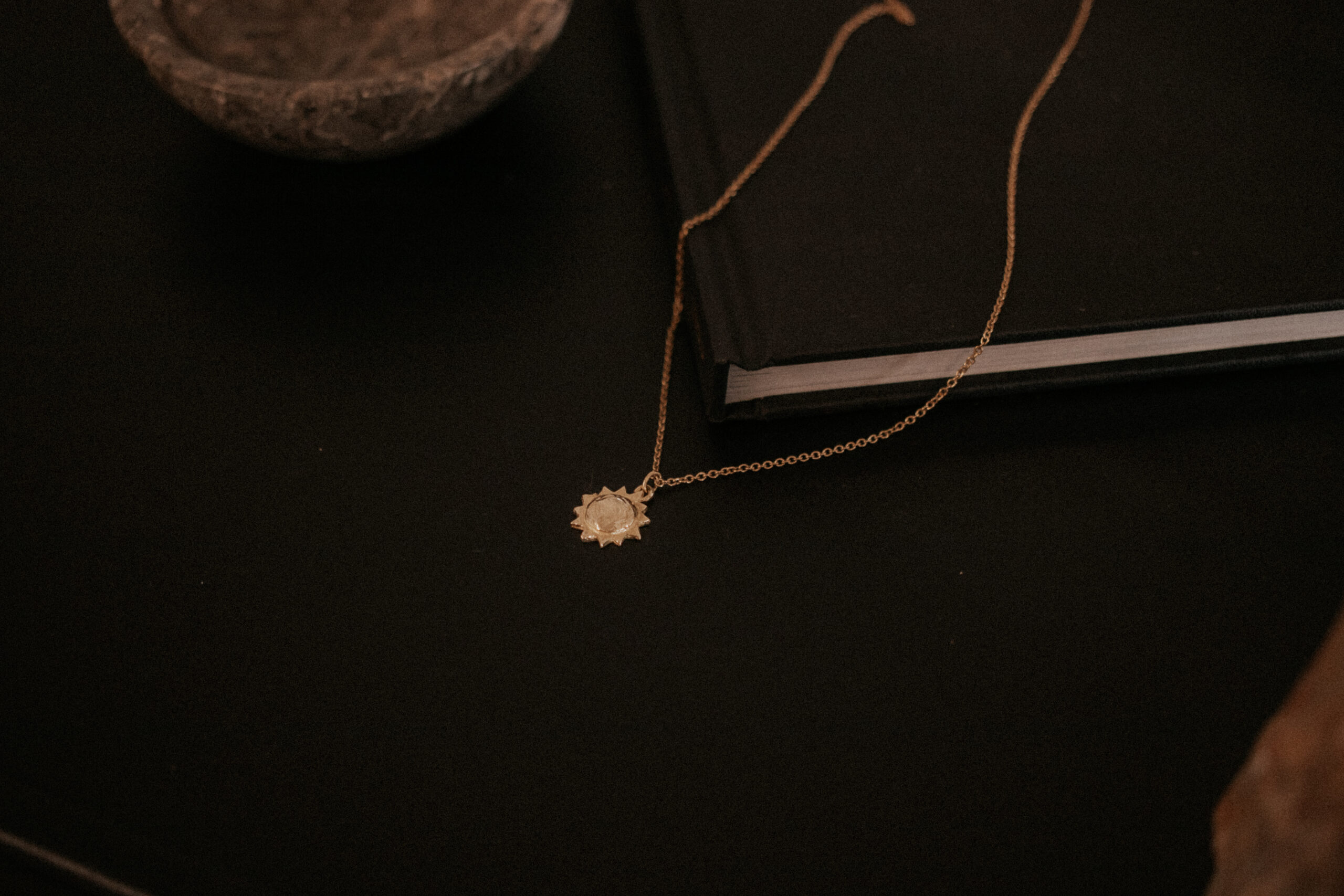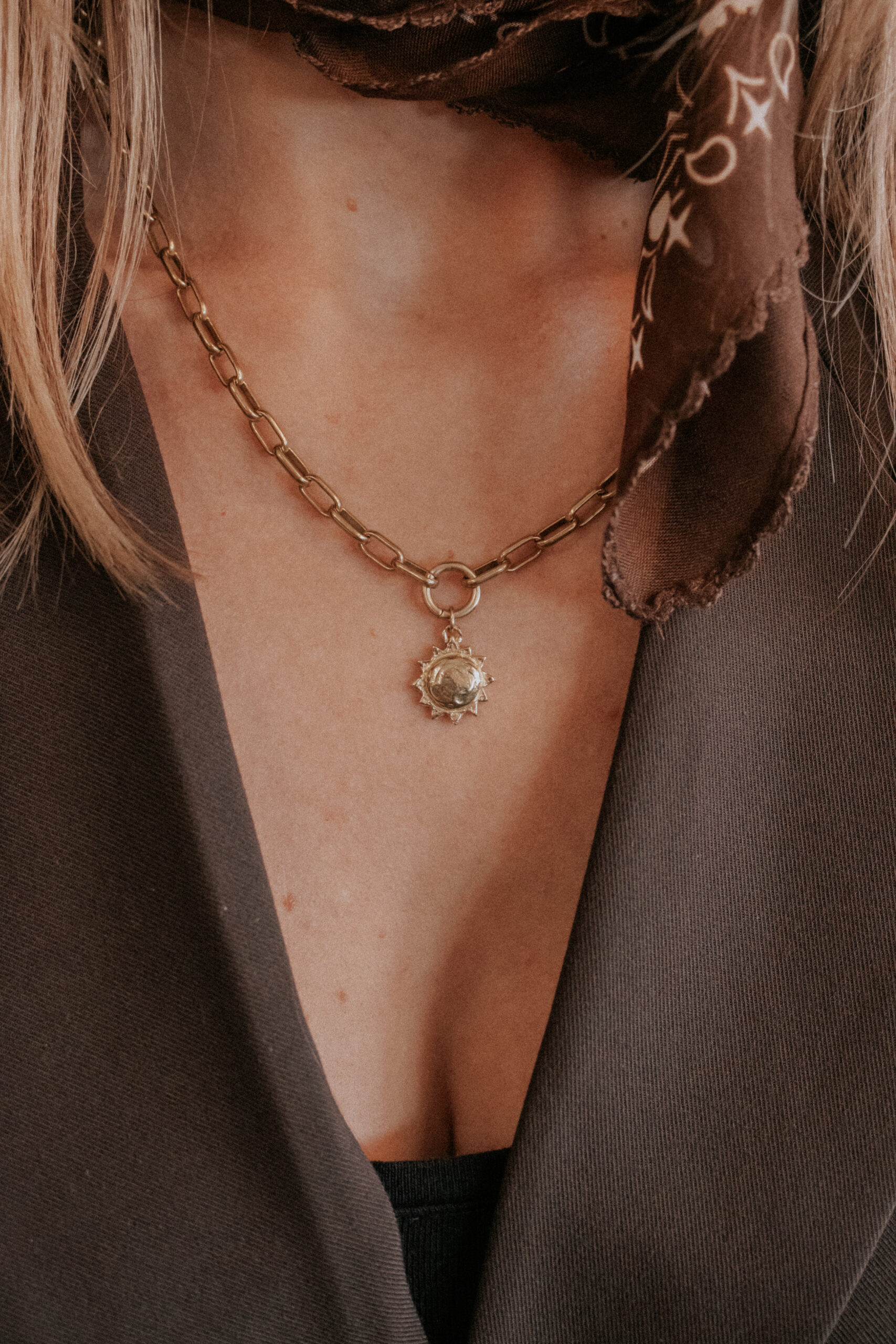 Een limited edition root to rise ketting met bedel, handgemaakt uit warm goudkleurig brass (messing). Elke bedel wordt met de hand vervaardigd en is daardoor altijd uniek. De bedel is ongeveer 15 x 17,5 mm groot.