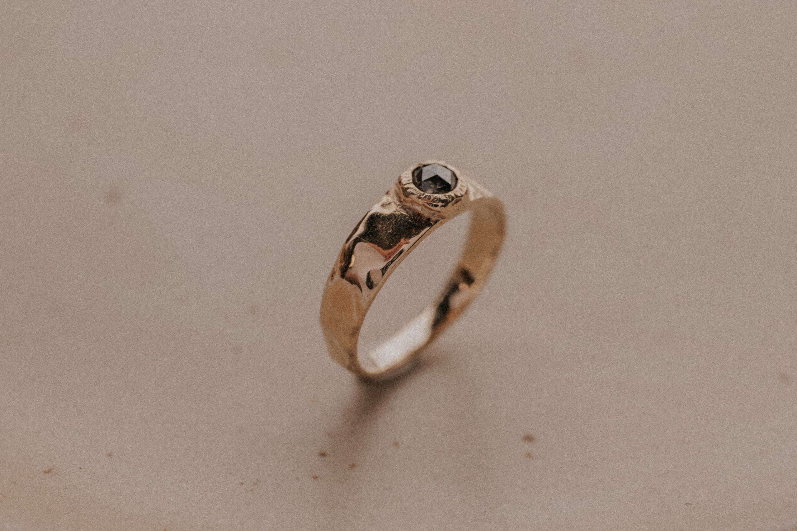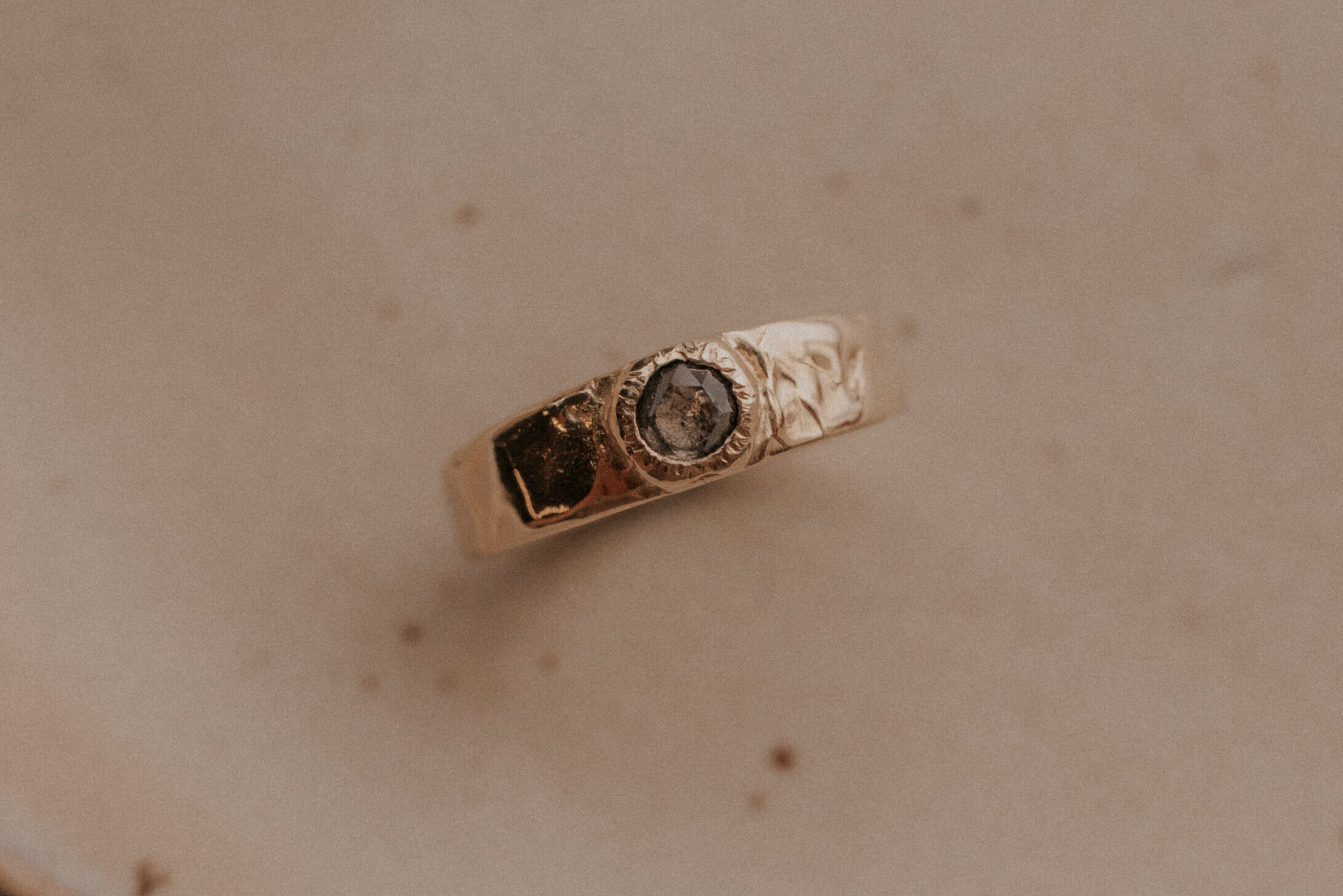 Molten Salt & Pepper Diamond ring. An organically formed ring with a round, rose cut diamond. The salt & pepper diamond that is incorporated into this ring is about 4 mm.