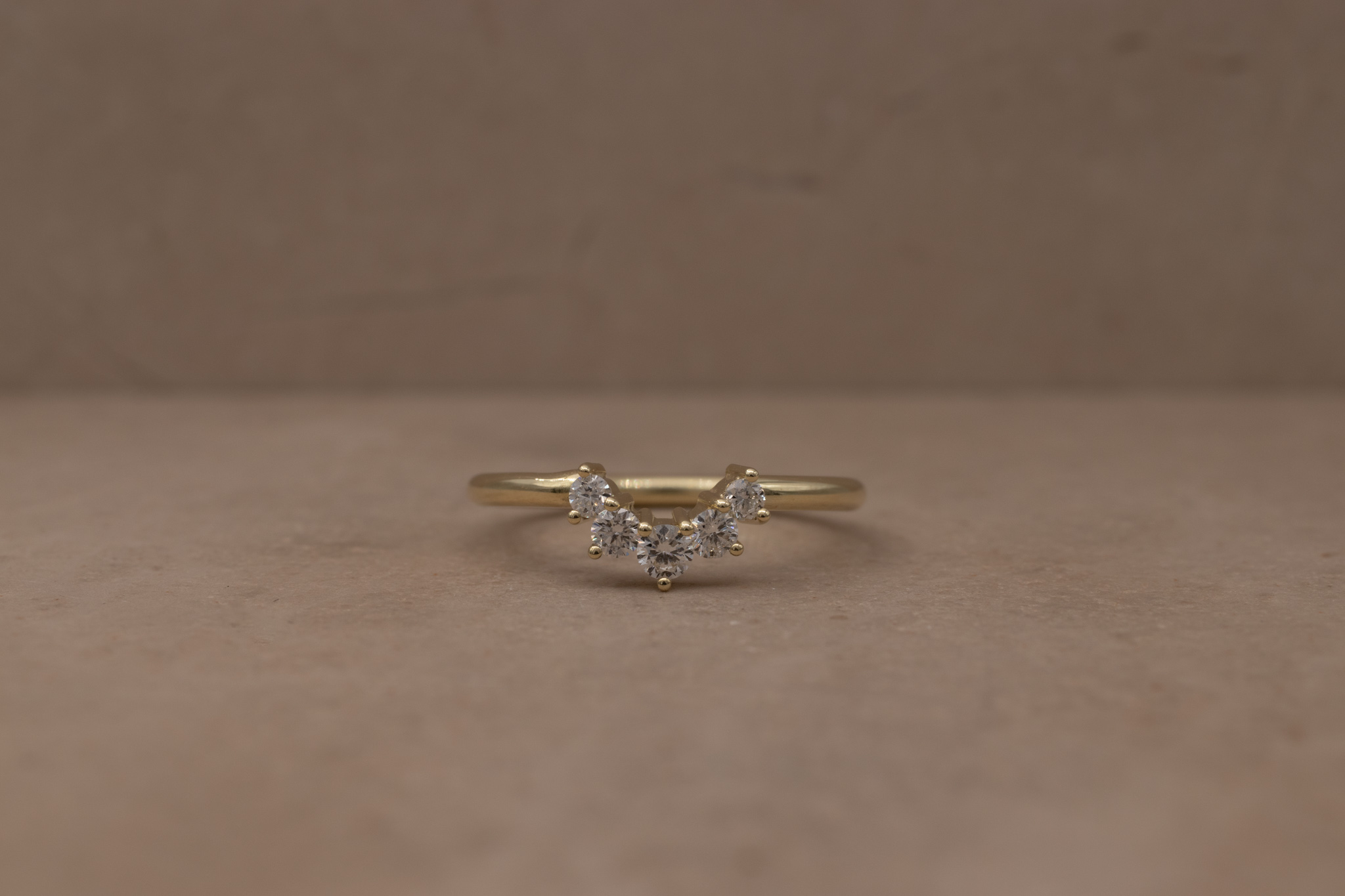 Deze 14 karaat geelgouden ring/dames trouwring wordt op bestelling gemaakt in ons goudsmid atelier. De ring is 1.6 mm dik en is verrijkt met vijf briljantgeslepen diamanten van 2.1, 2.3 en 2.5 mm groot (ongeveer 0.23 karaat in totaal).
