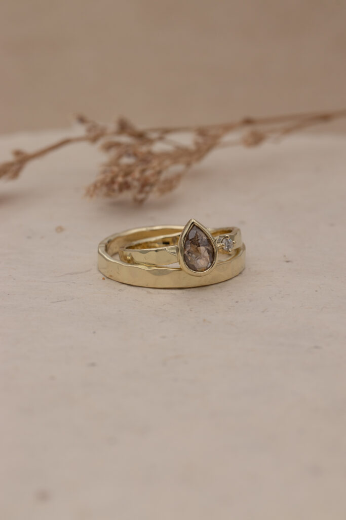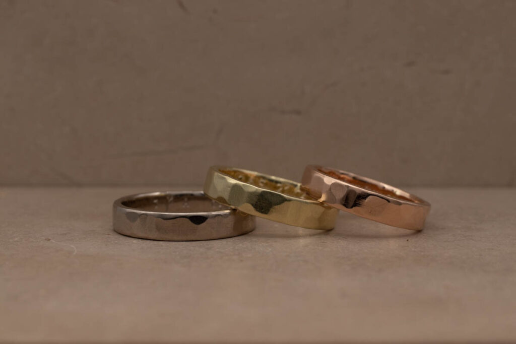 Houd je van een ring met een natuurlijke, ambachtelijke uitstraling? Dan is een gehamerde afwerking een mooie optie om te overwegen! Er zijn verschillende soorten structuren mogelijk—elk met een eigen unieke look and feel. Denk aan een zachte, organische structuur of juist een strakker patroon met zichtbare vlakken. We lichten de verschillende hamerslagen kort toe: