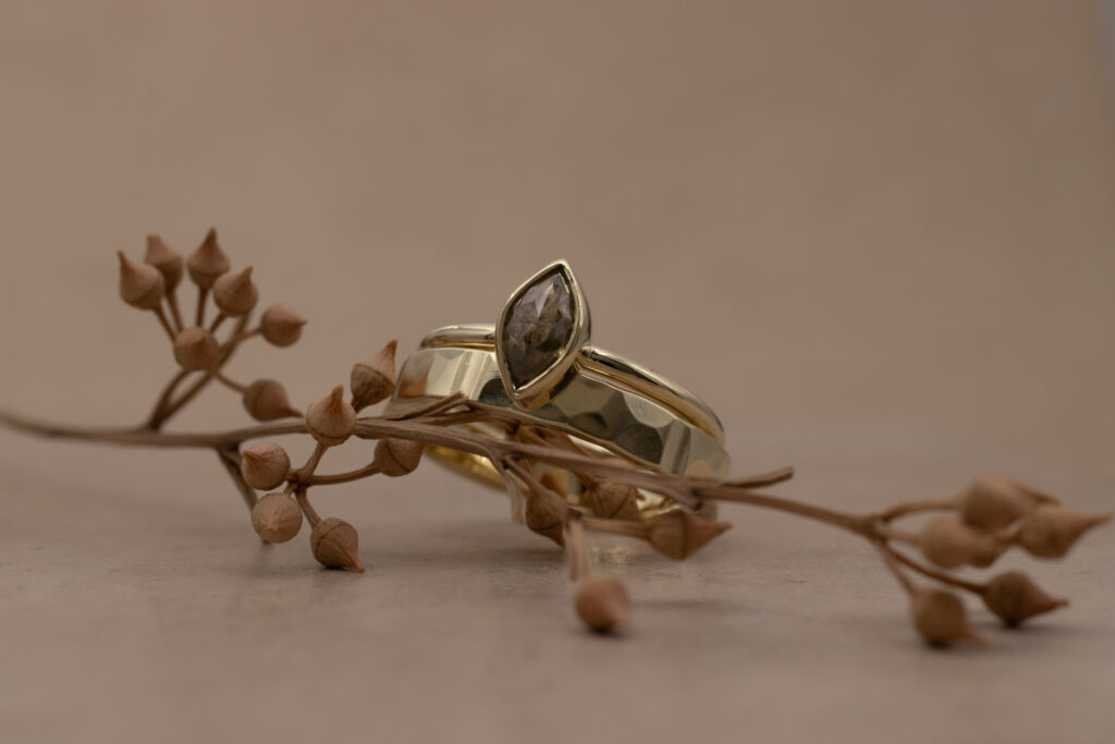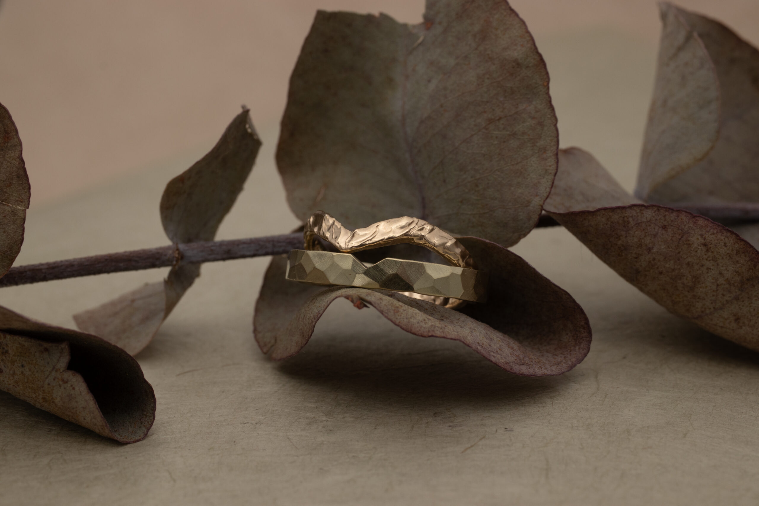 Strakke, langwerpige hamerslagen die zorgen voor een subtiel lijnenspel in de ring.