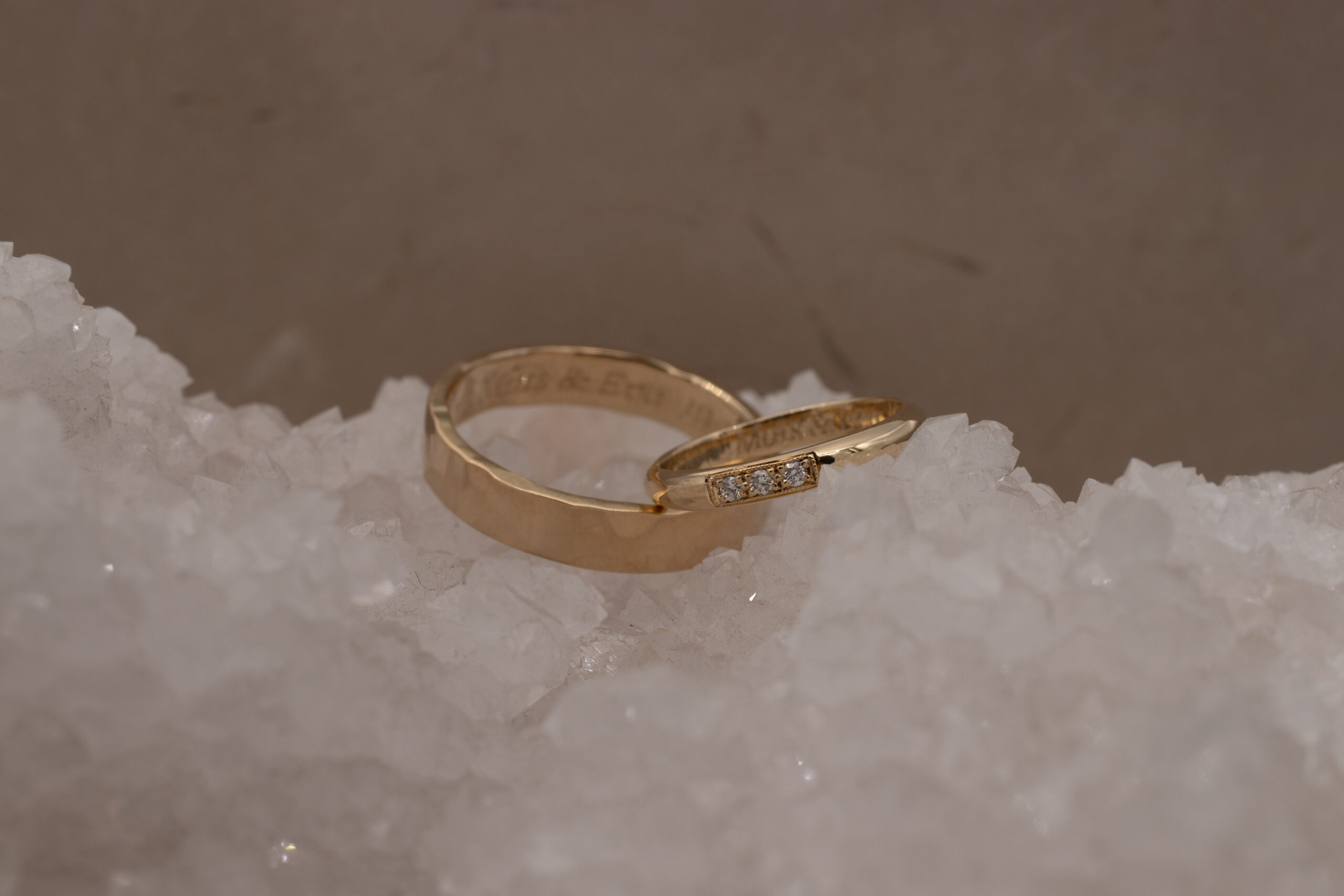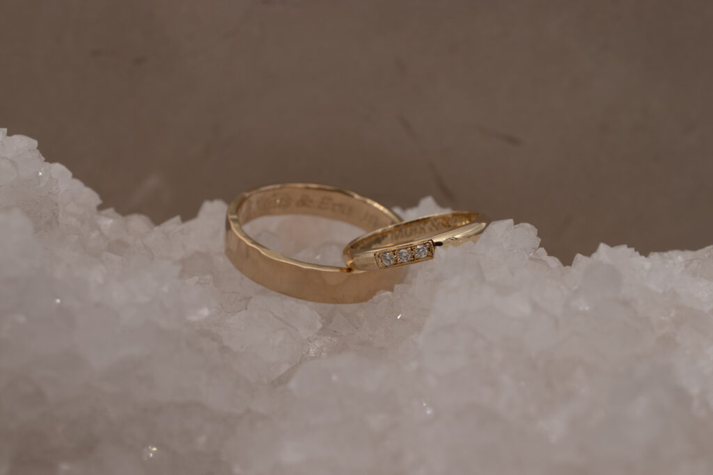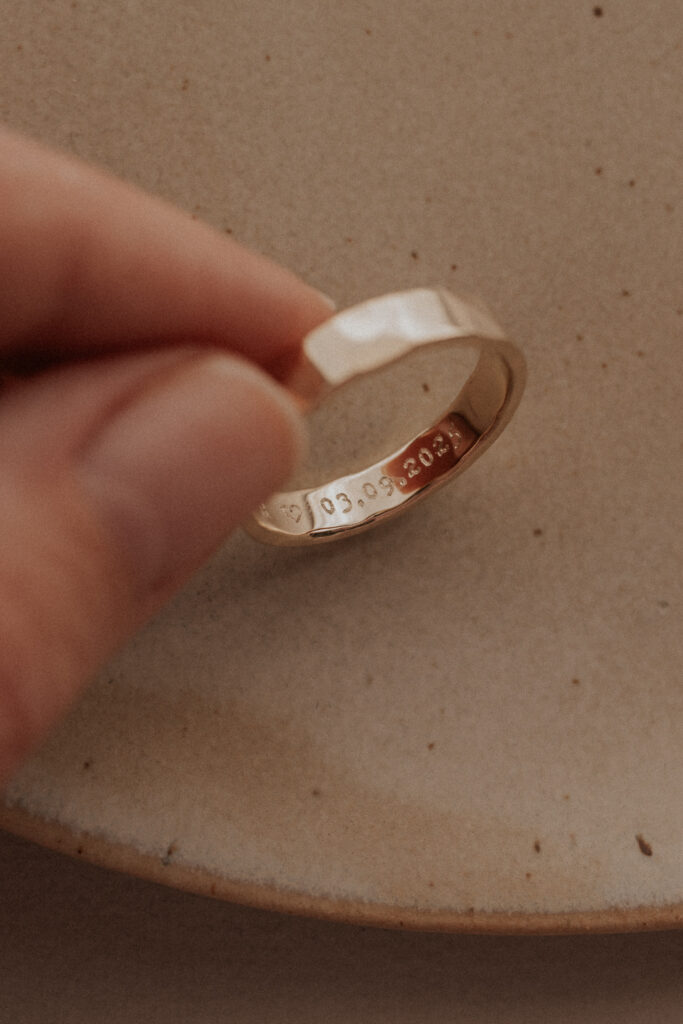 Een gravure is misschien wel de meest persoonlijke en intieme toevoeging aan trouwringen. Het is een detail dat niet zichtbaar is voor de buitenwereld, maar des te betekenisvoller voor jullie samen. Denk aan jullie trouwdatum, initialen, een woord of korte zin die jullie verbindt, of zelfs een symbool of handgeschreven boodschap.