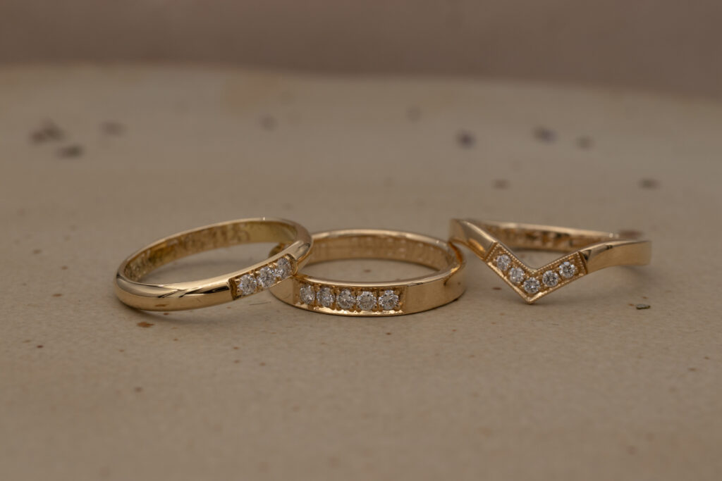 Een trouwring is allang niet meer gebonden aan vaste tradities. Tegenwoordig zijn er eindeloos veel manieren om jouw ring uniek en helemaal persoonlijk te maken. Ga je voor een gehamerde ring of juist een ring met gladde afwerking? Eén subtiel diamantje of meerdere stenen? Witgoud of klassiek geelgoud? We nemen je mee in 6 mooie manieren om jouw trouwring nét dat beetje extra karakter en eigenheid te geven.